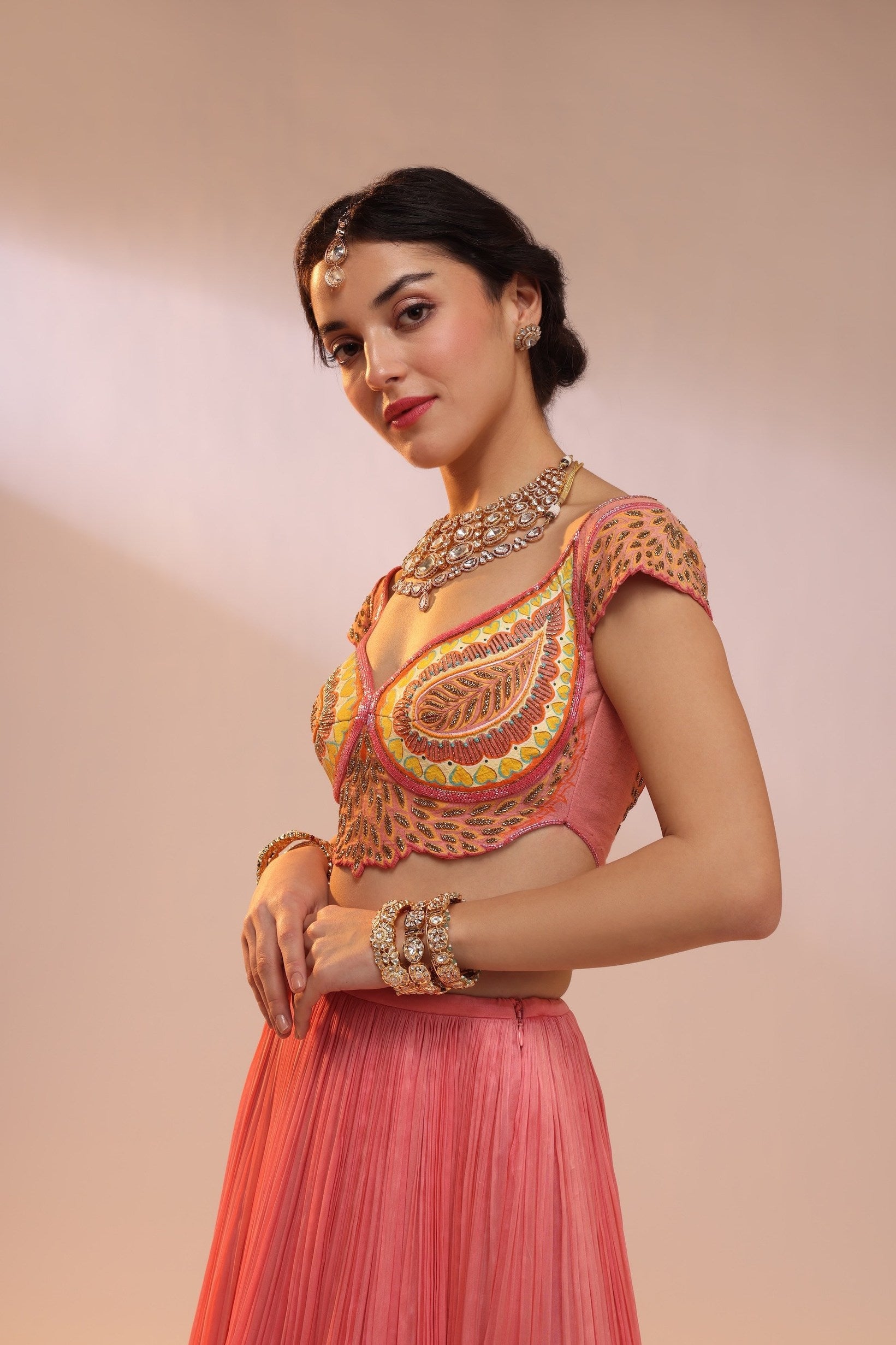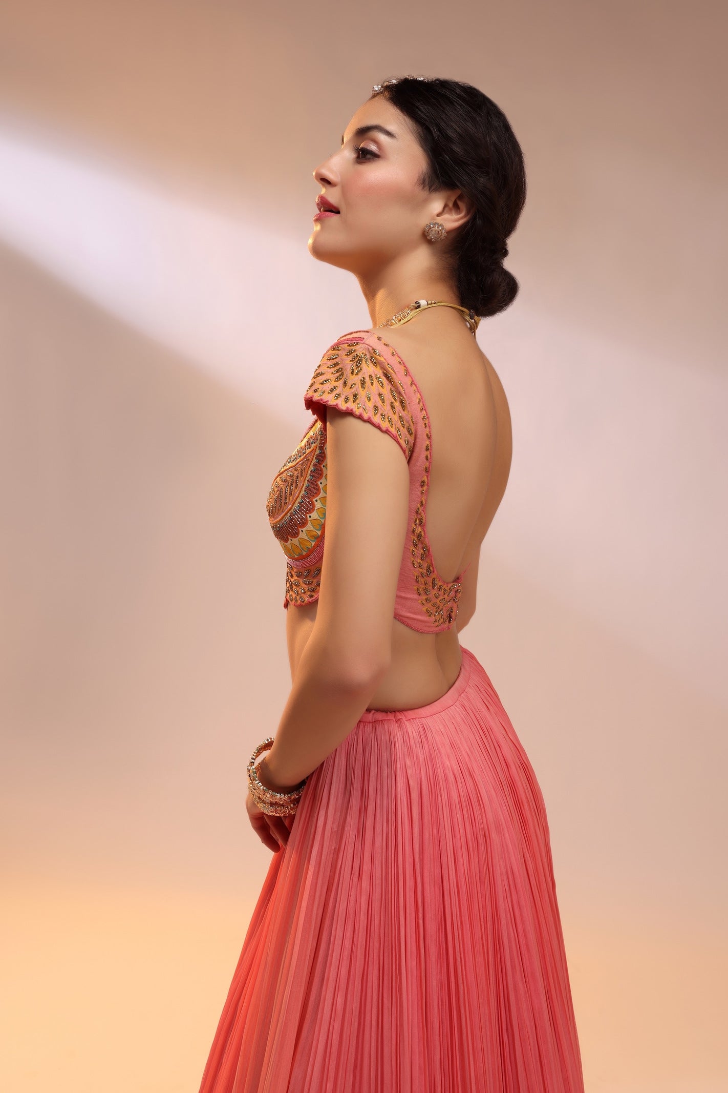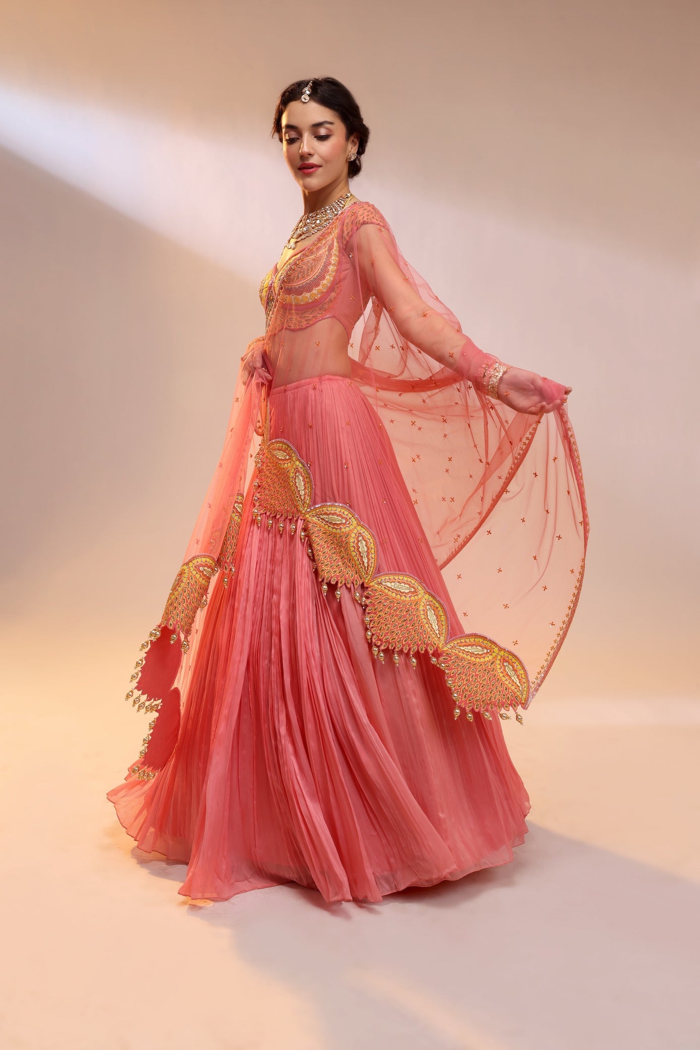 The Aani Lehenga Set, crafted from fine silk, features a hand-painted blouse and a hand-pleated lehenga. It is complemented by an exquisite cutwork dupatta adorned with hand-sewn tassels, creating a graceful ensemble.