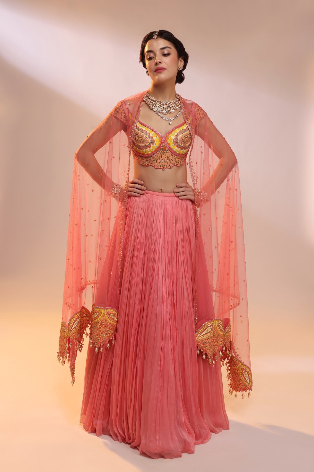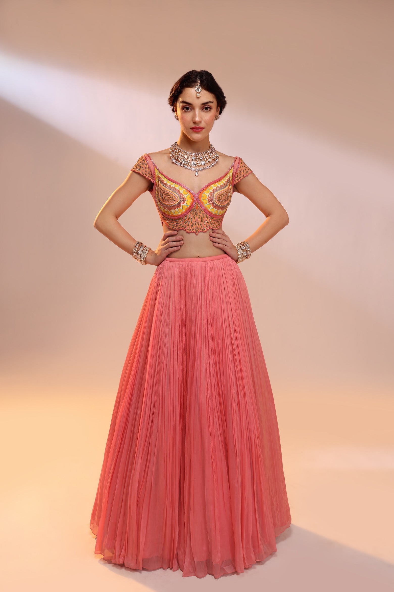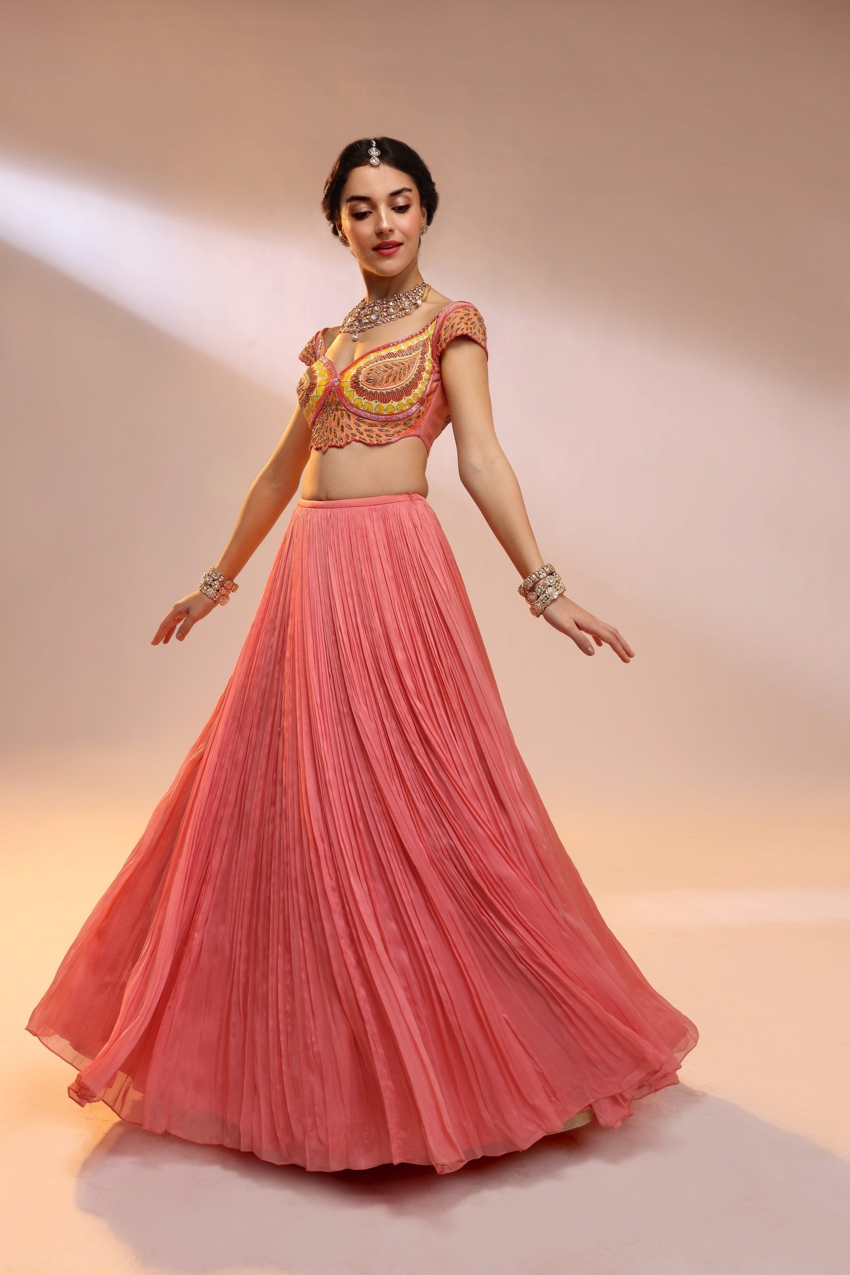 The Aani Lehenga Set, crafted from fine silk, features a hand-painted blouse and a hand-pleated lehenga. It is complemented by an exquisite cutwork dupatta adorned with hand-sewn tassels, creating a graceful ensemble.