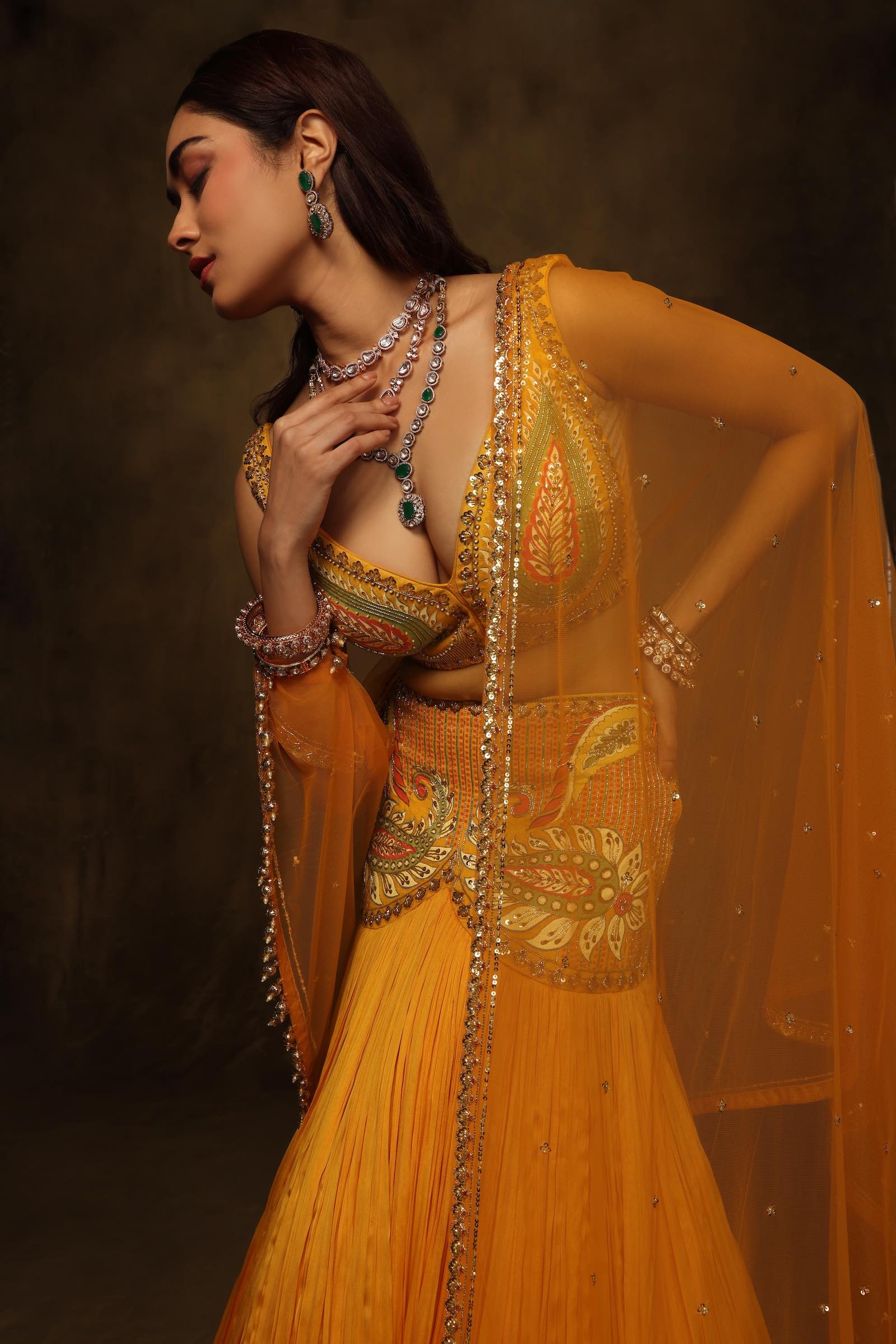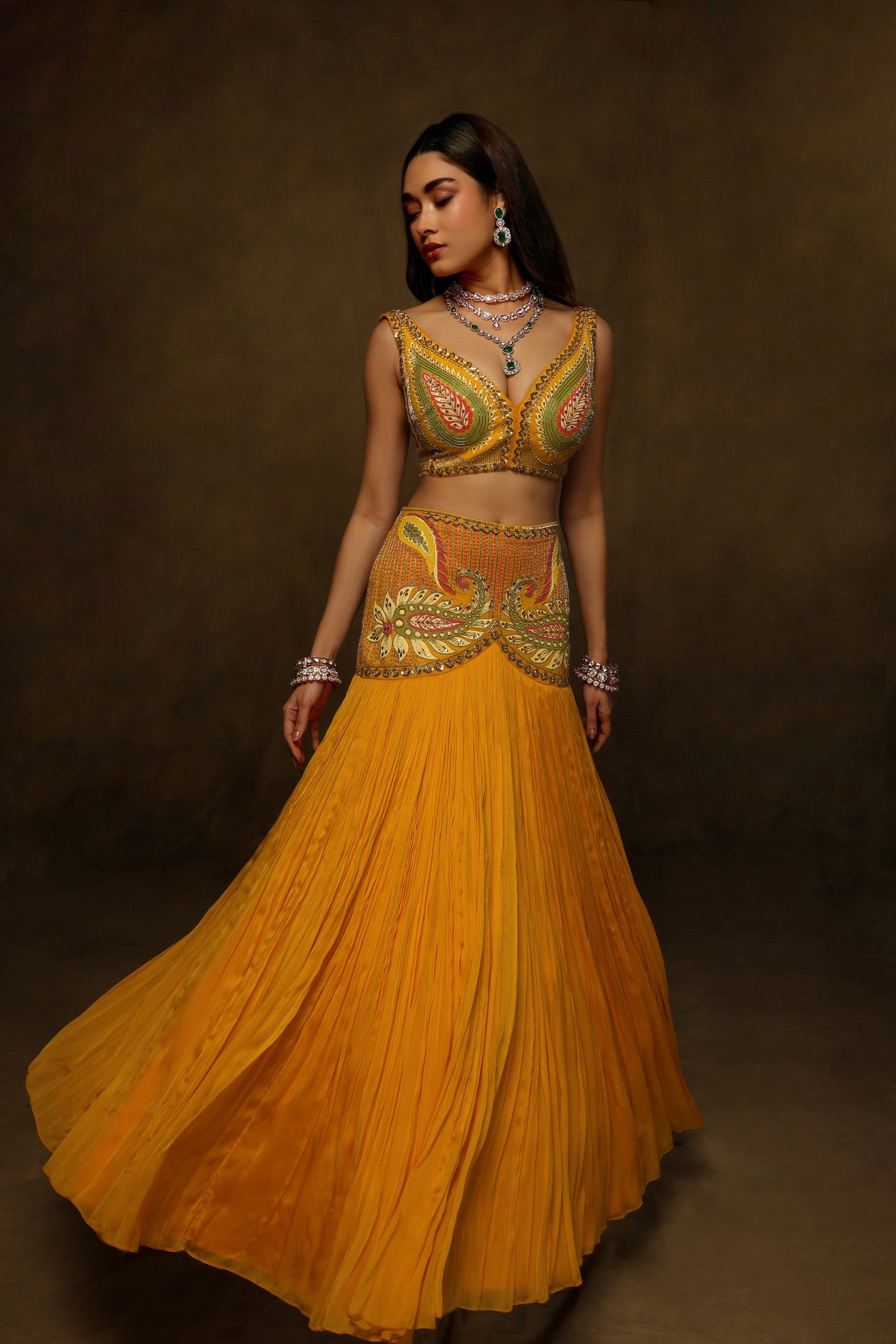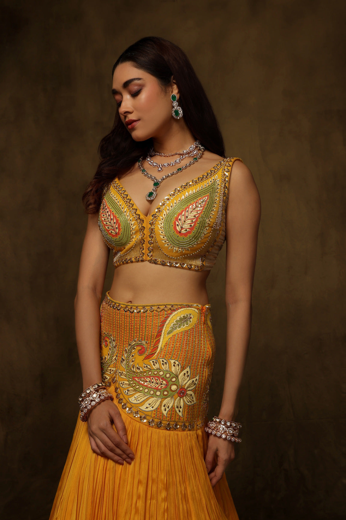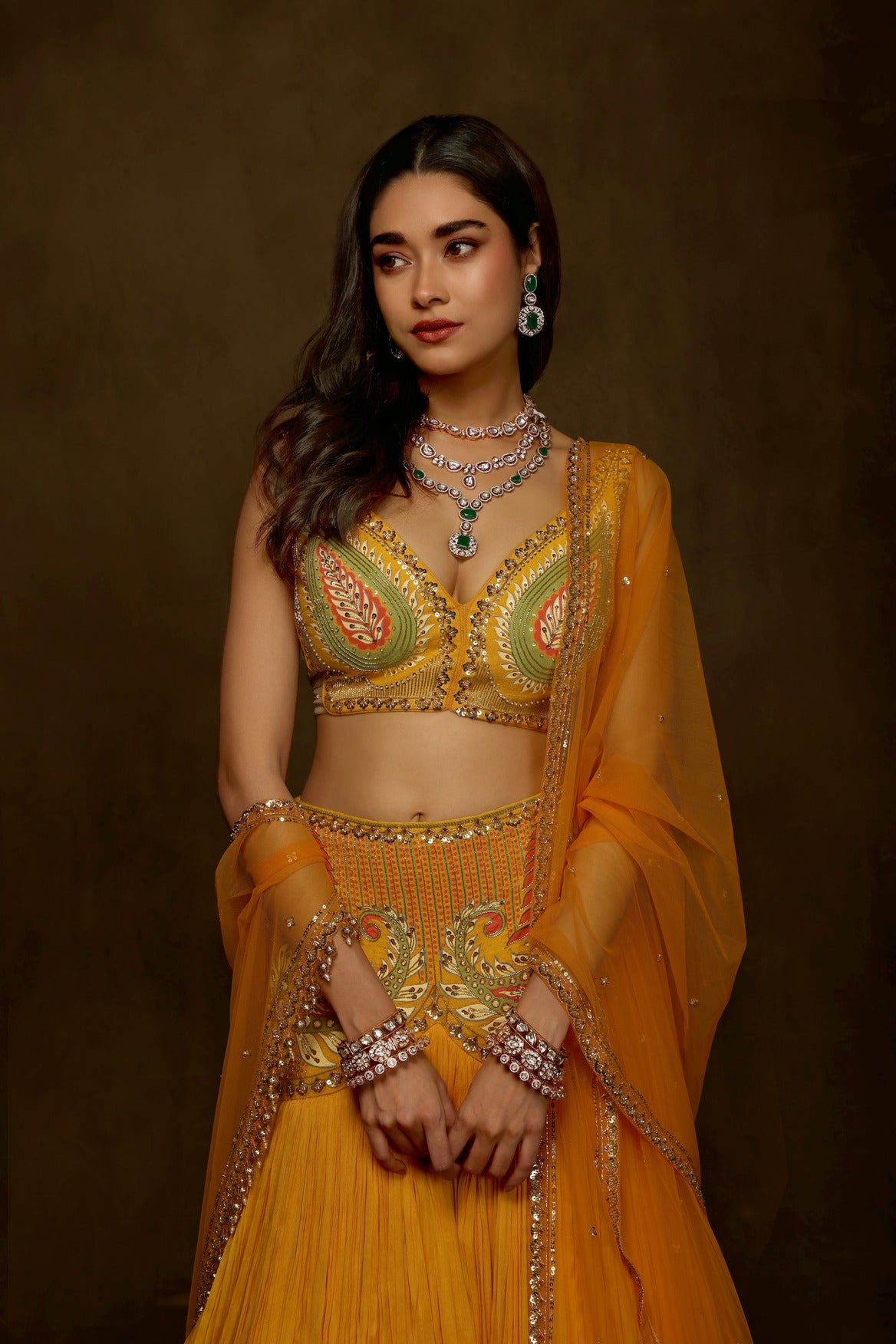 The Bindi Lehenga Set, blends traditional and contemporary styles for a flattering, tailored fit. Adorned with delicately painted custom-made keri motifs, it is complemented by a richly crafted orange and gold dupatta, embodying timeless elegance and comfort.