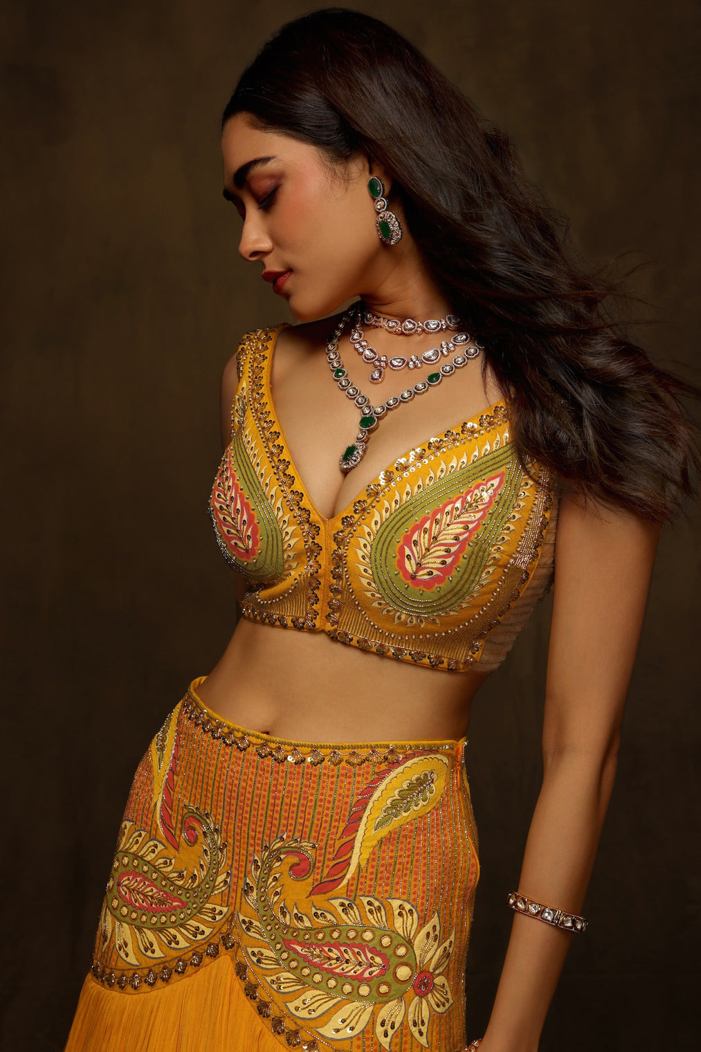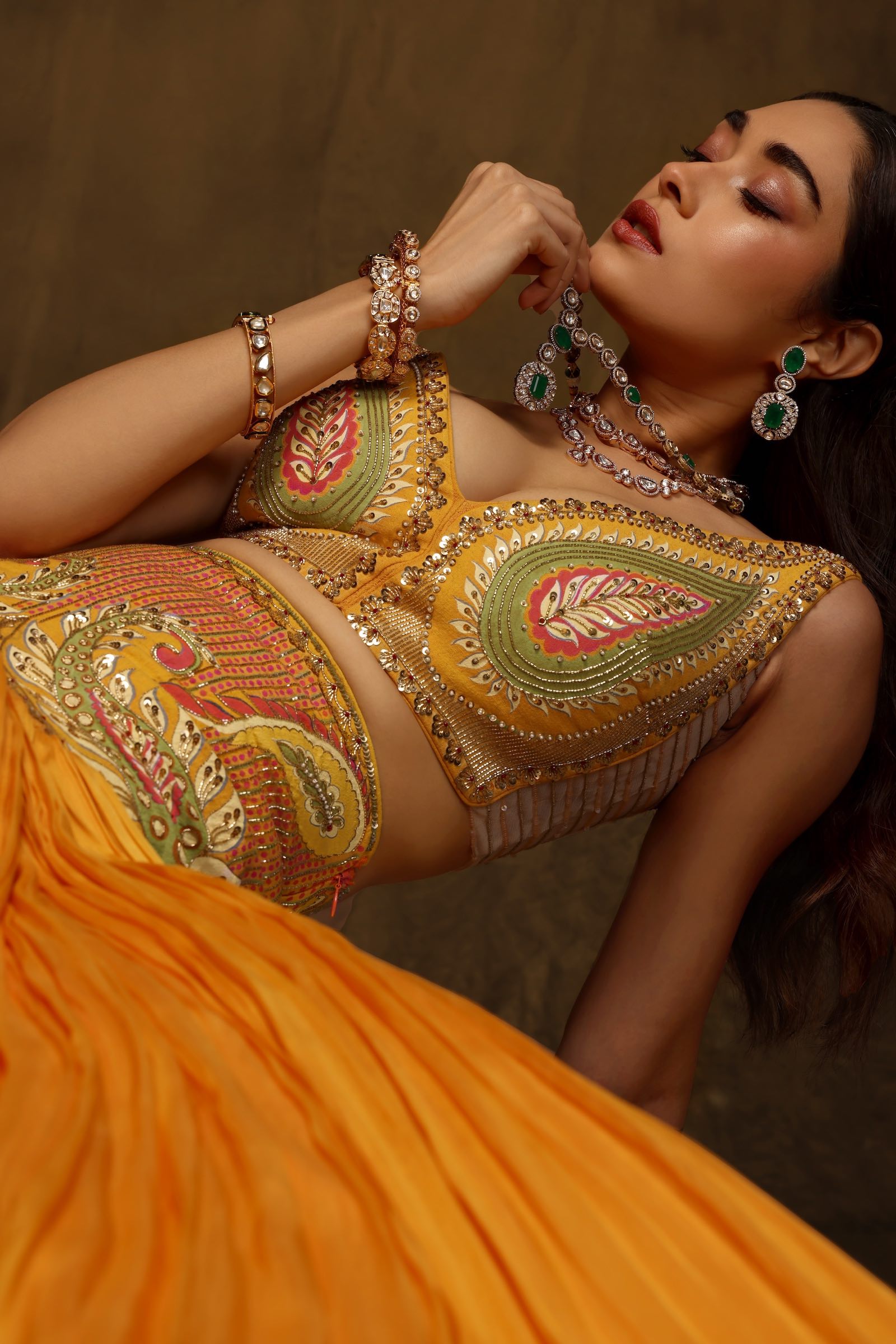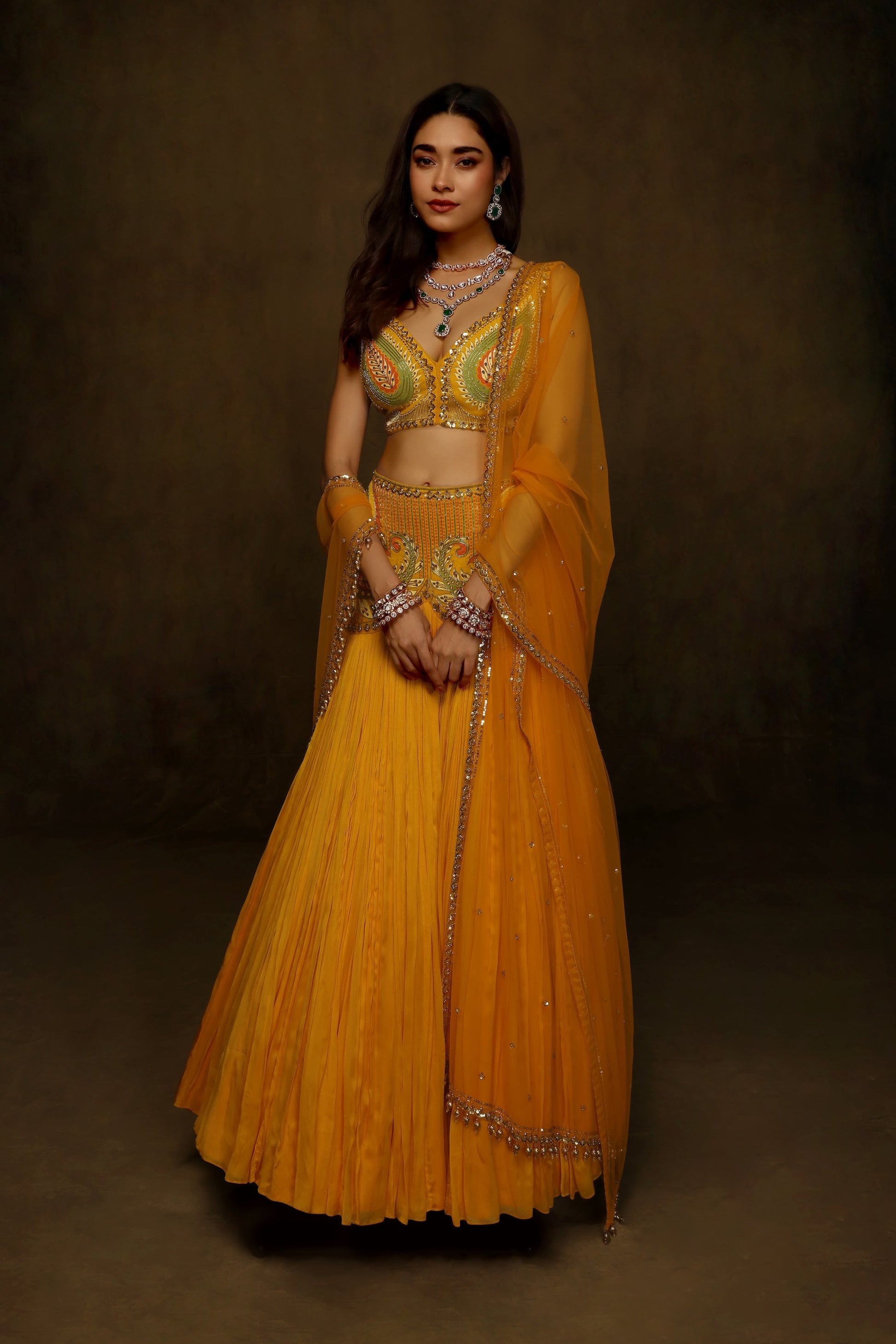 The Bindi Lehenga Set, blends traditional and contemporary styles for a flattering, tailored fit. Adorned with delicately painted custom-made keri motifs, it is complemented by a richly crafted orange and gold dupatta, embodying timeless elegance and comfort.