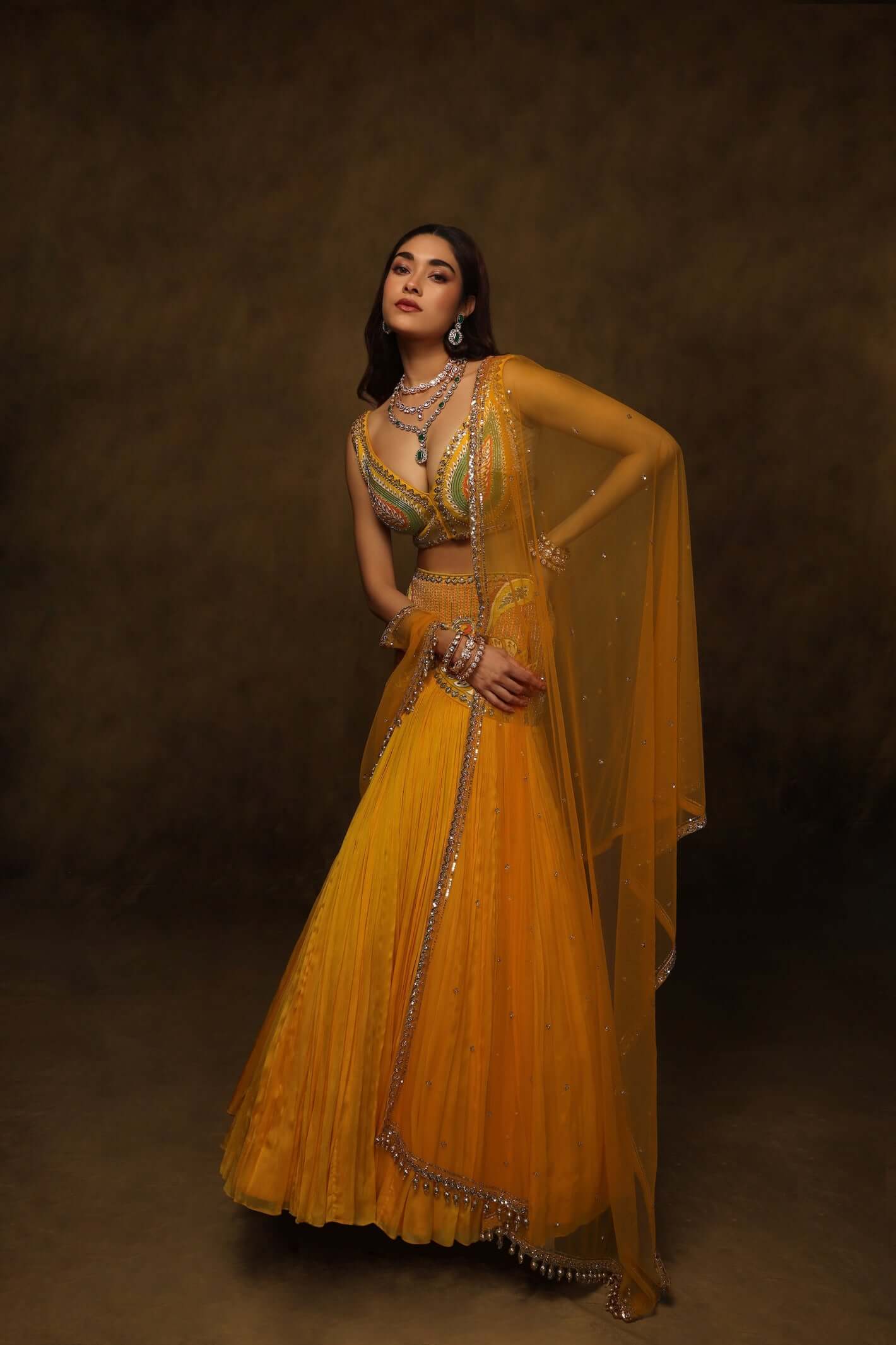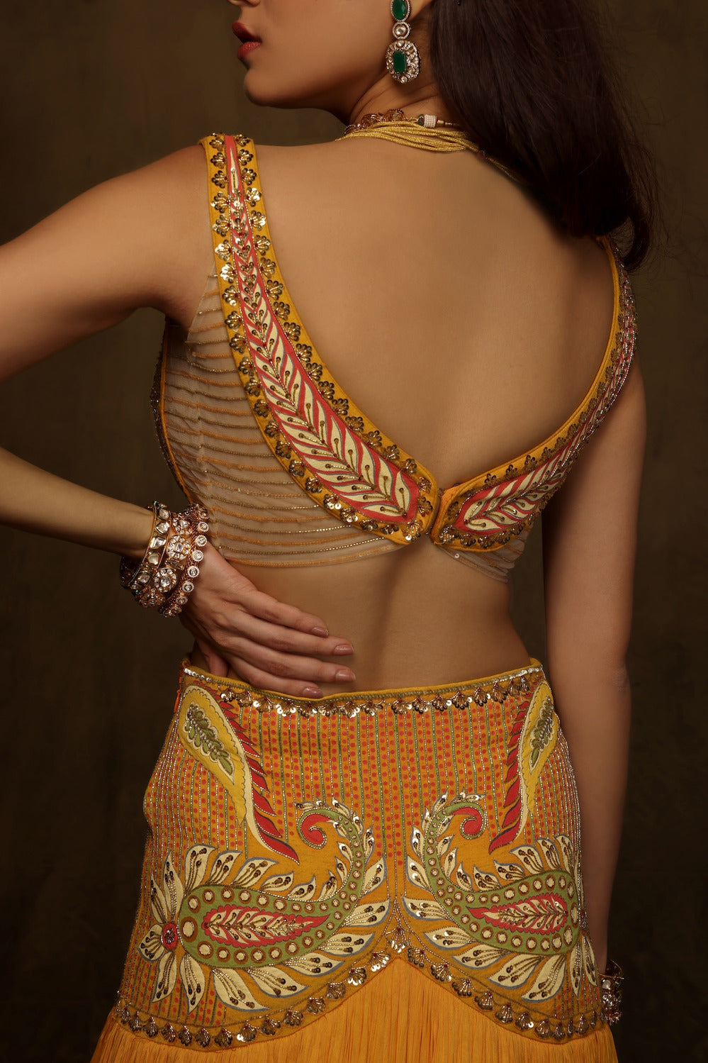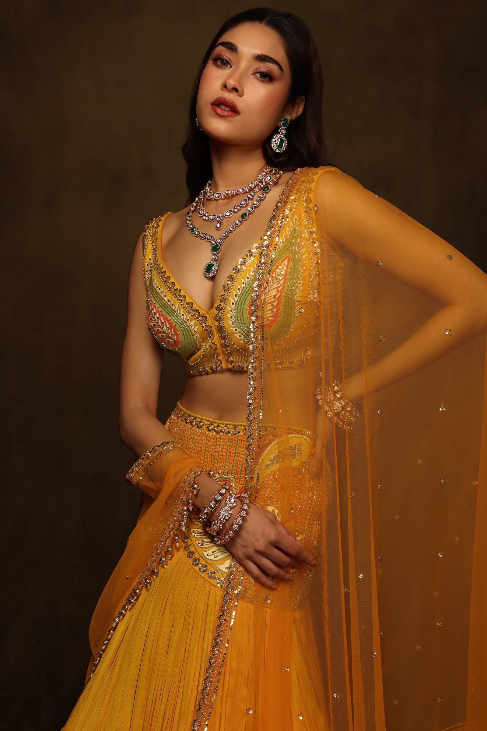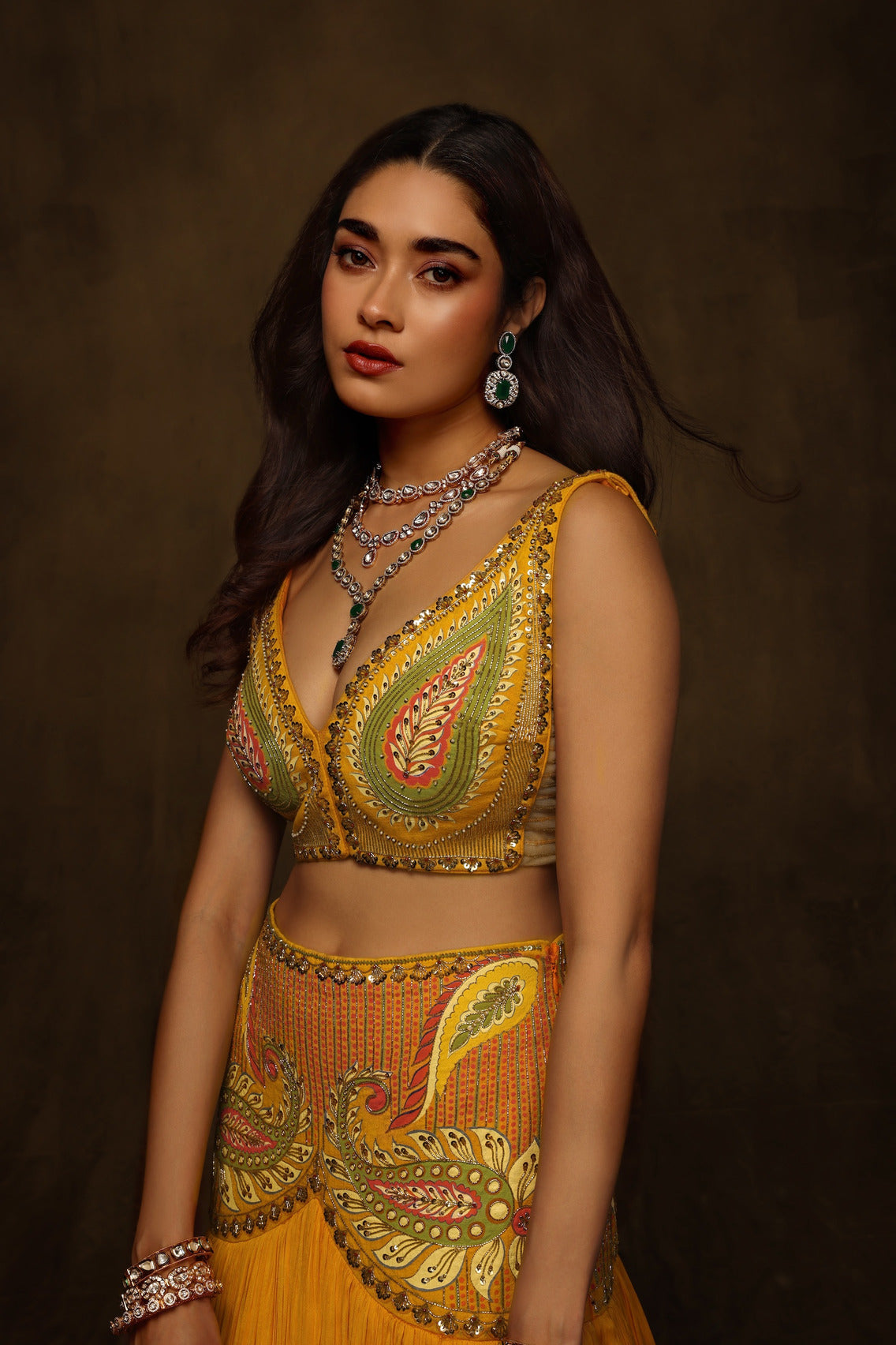 The Bindi Lehenga Set, blends traditional and contemporary styles for a flattering, tailored fit. Adorned with delicately painted custom-made keri motifs, it is complemented by a richly crafted orange and gold dupatta, embodying timeless elegance and comfort.