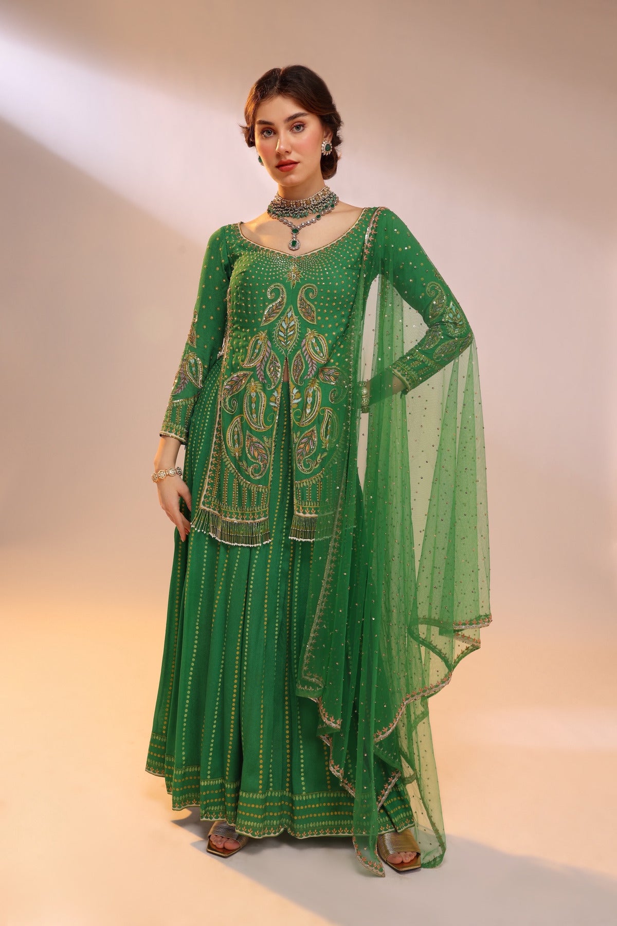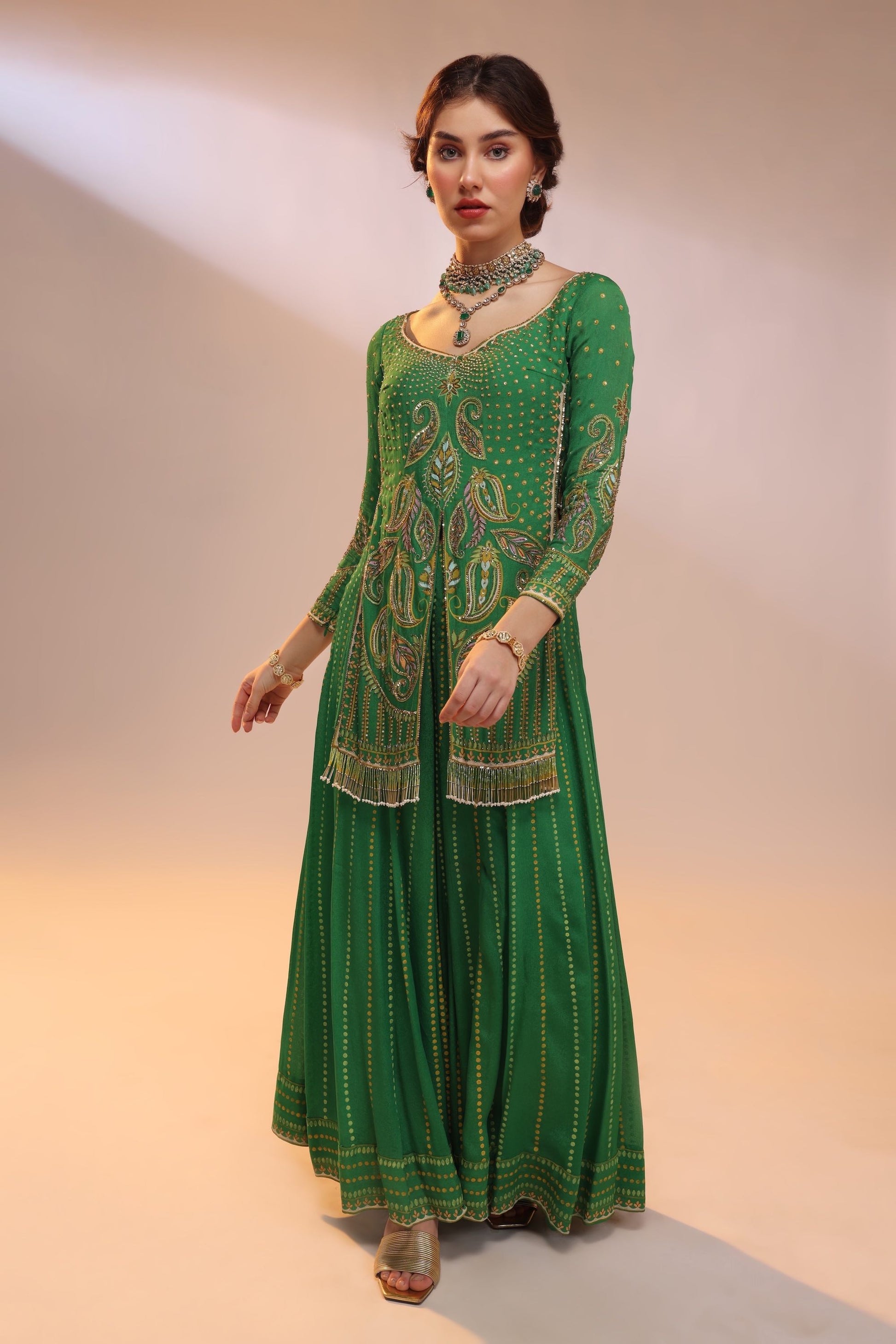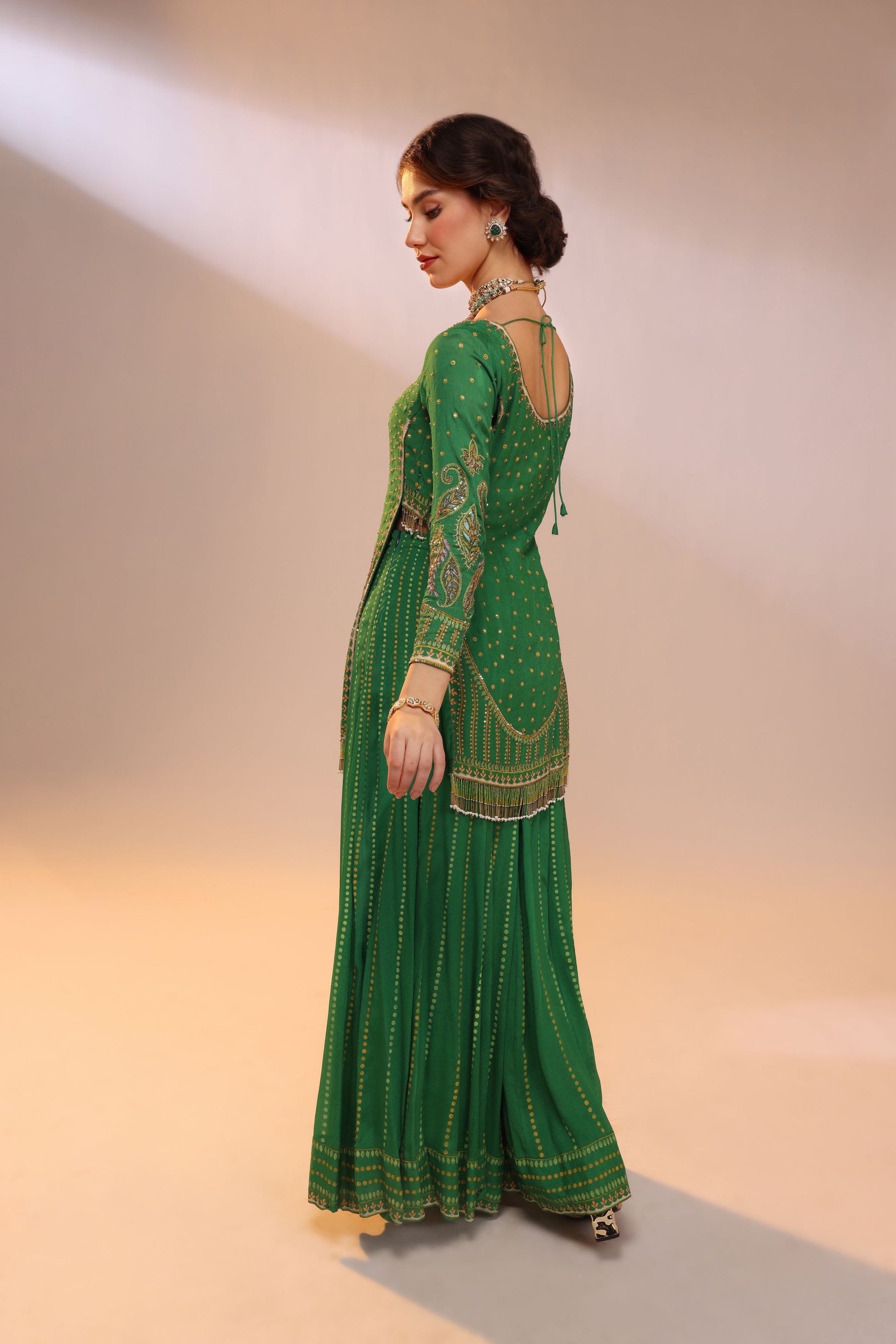 The Green Mang Set features a unique flap blouse highlighting artisanal keri motifs, subtle sequin fades, and lively tassels, creating a charming ensemble. It is complemented by a hand-painted palazzo and a beautiful dupatta.