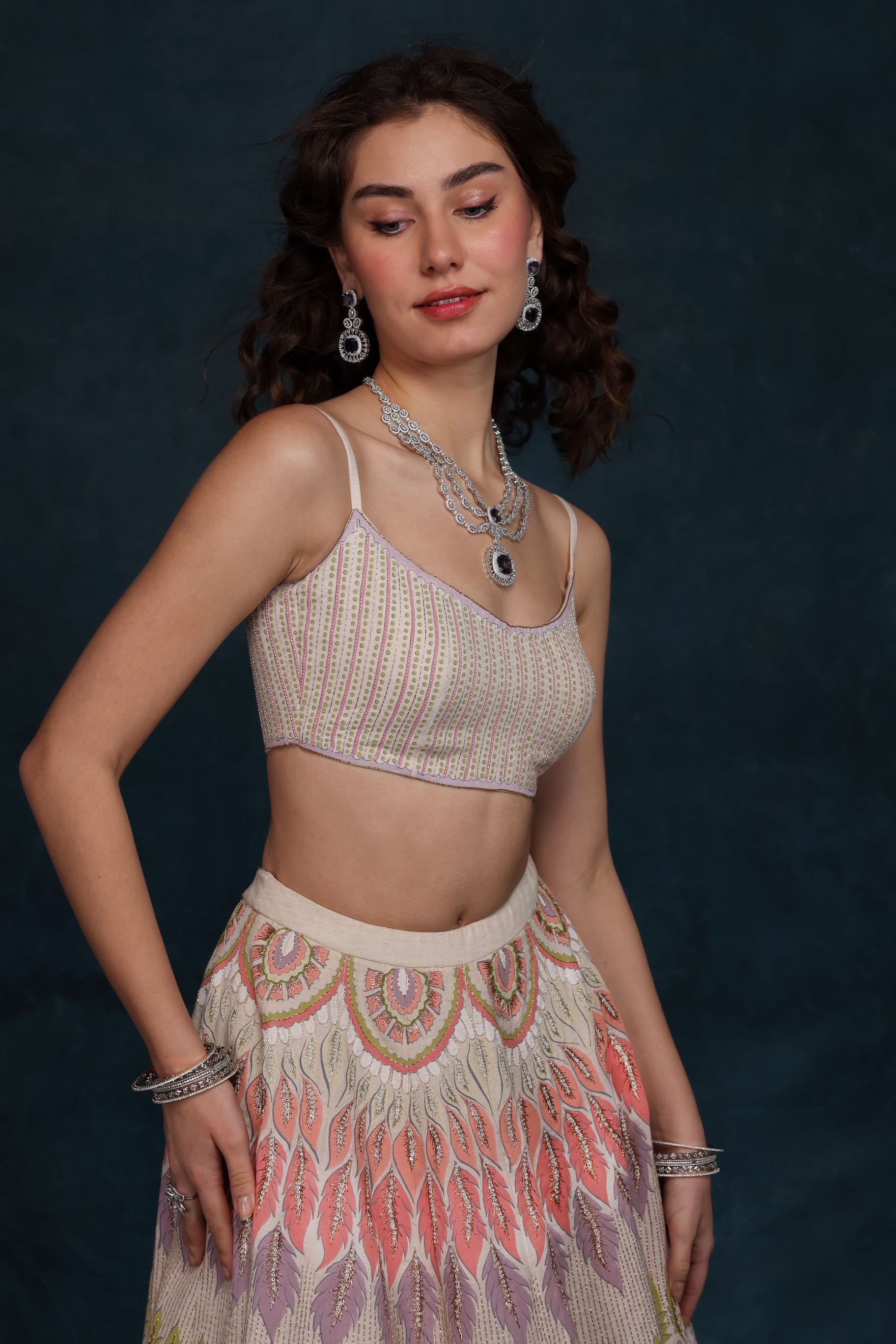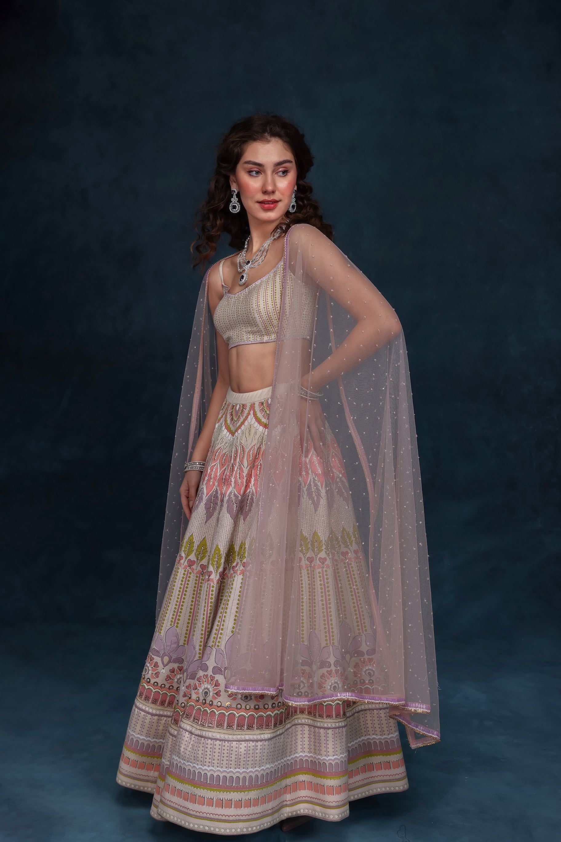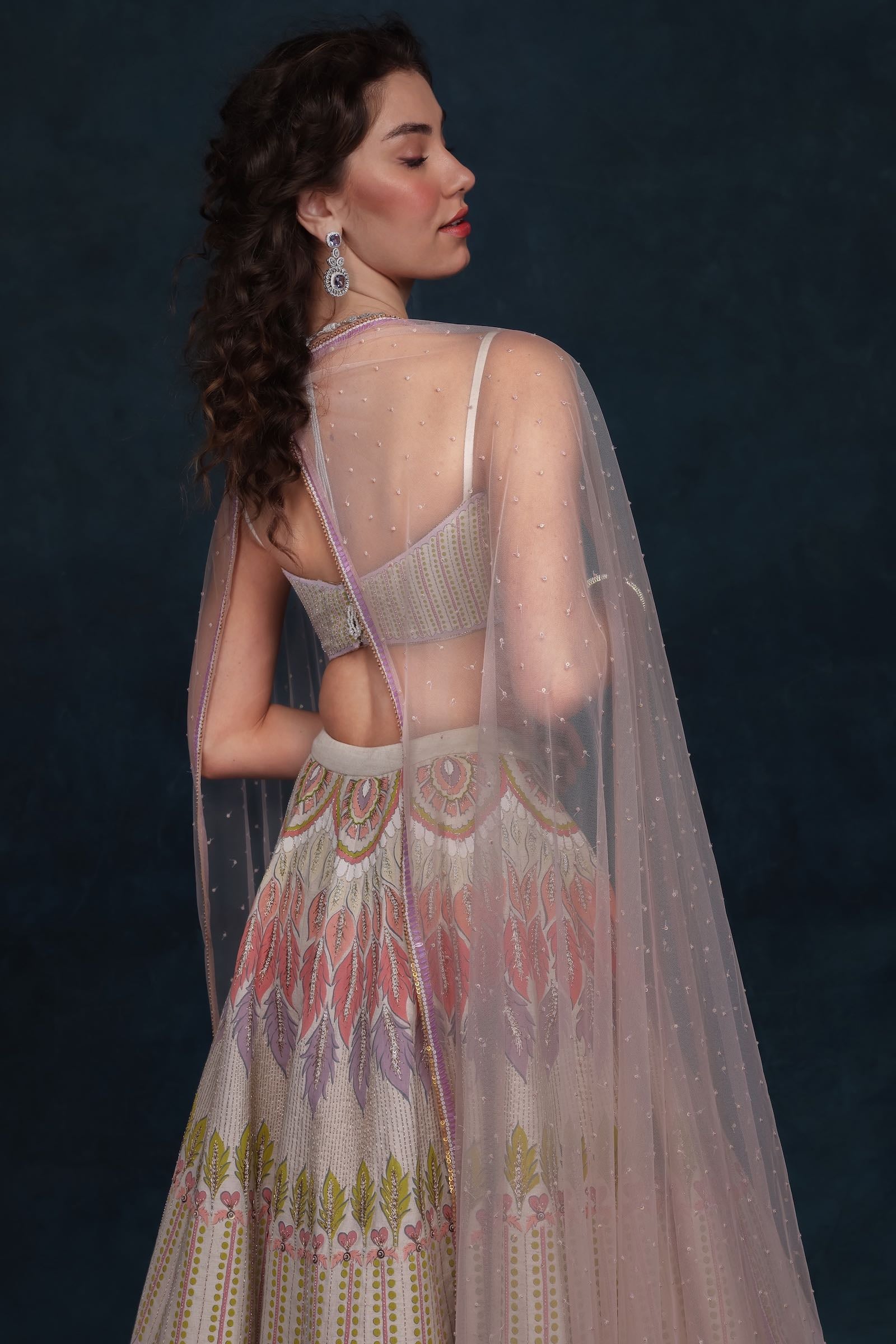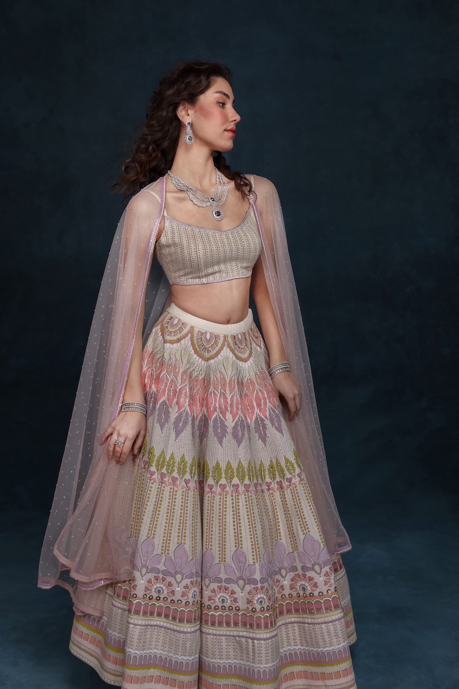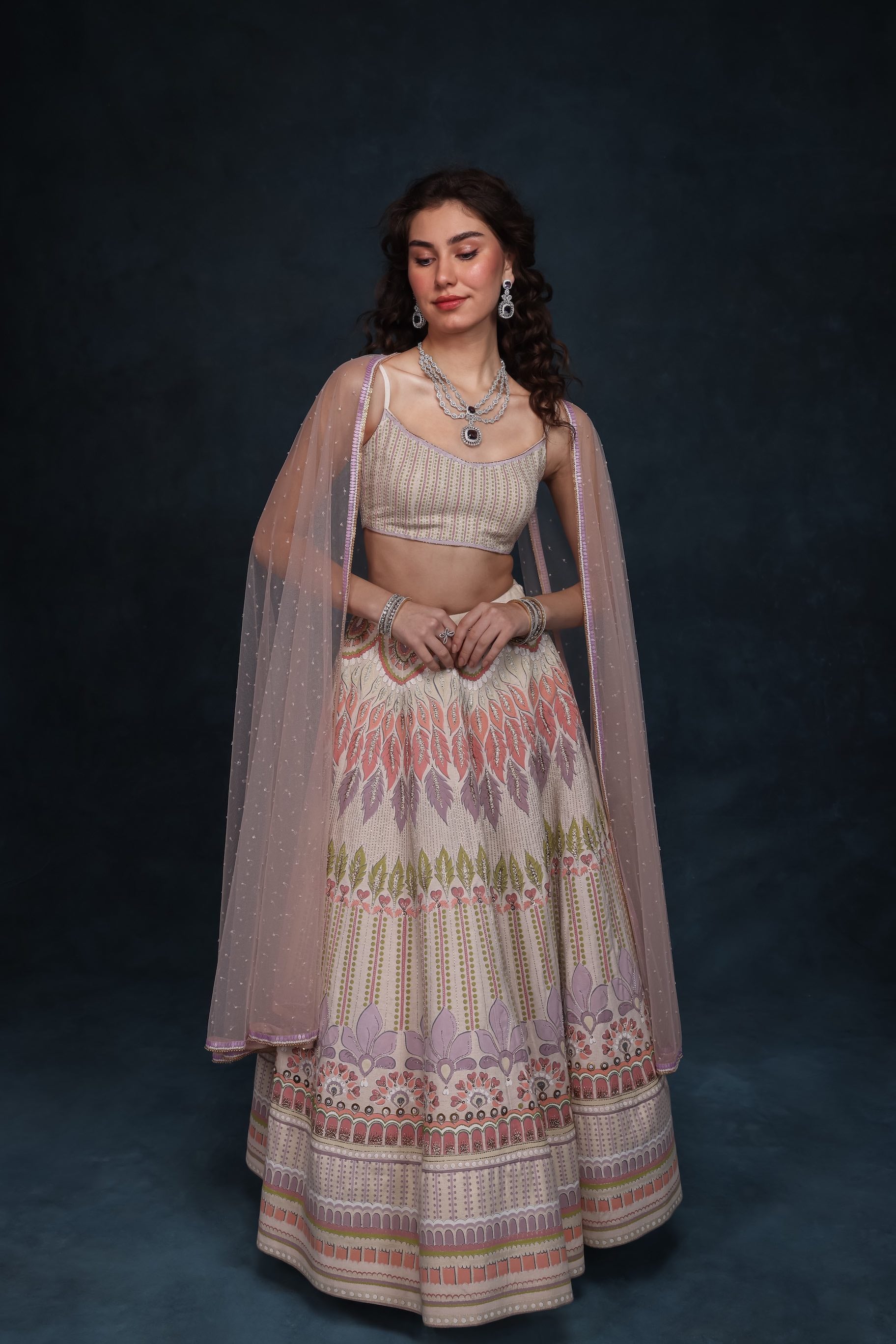 The Labh Lehenga Set showcases delicate hand-painted motifs inspired by nature, complemented by dainty embroidery, subtle playful shades, and a stylized dupatta, creating a distinctive and beautiful ensemble.