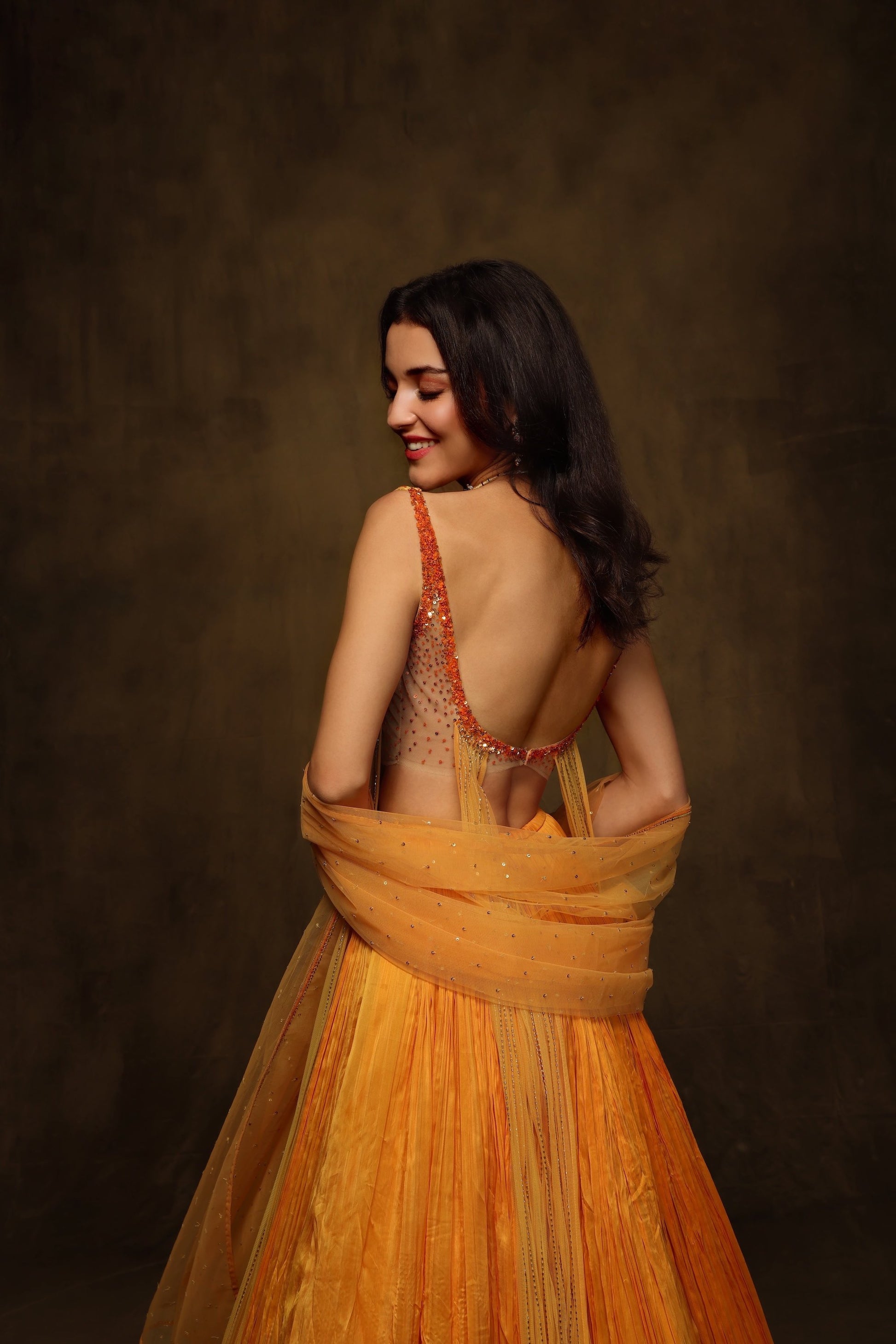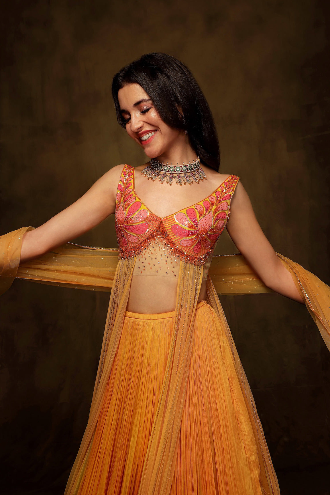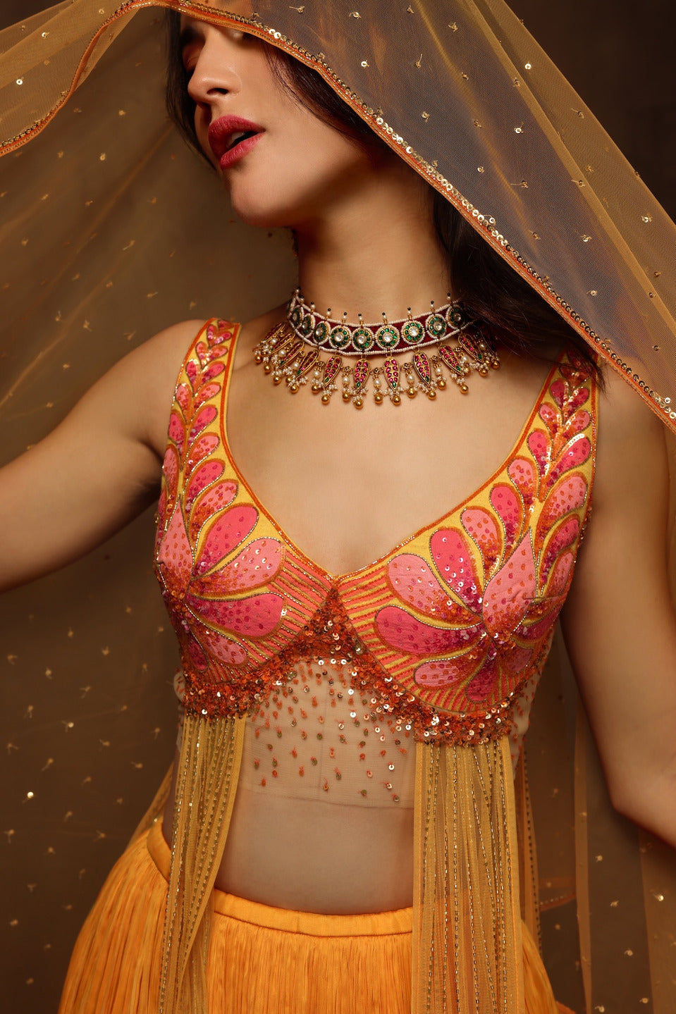 Delicately emerging through the fading sequins of the blouse, the tulle flaps create a unique modern silhouette. The joyful swirl of motifs, paired with a hand-pleated fine silk lehenga and a delicate dupatta, come together to present a dainty, distinctive, and stunning appearance.