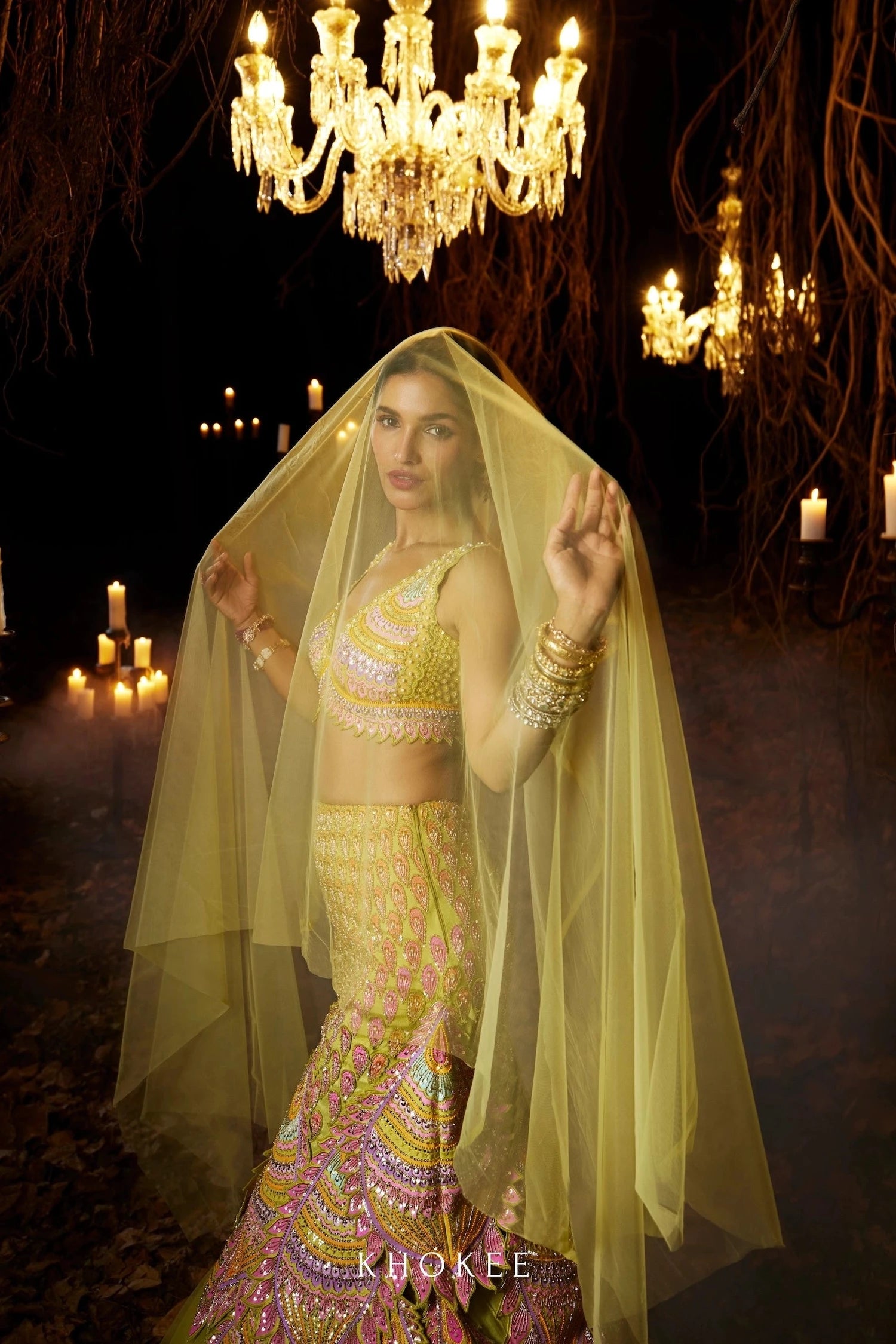 The Marina Bloom glows like a wild bloom at dusk: green petals, pink whispers, and gold dancing under the chandeliers.