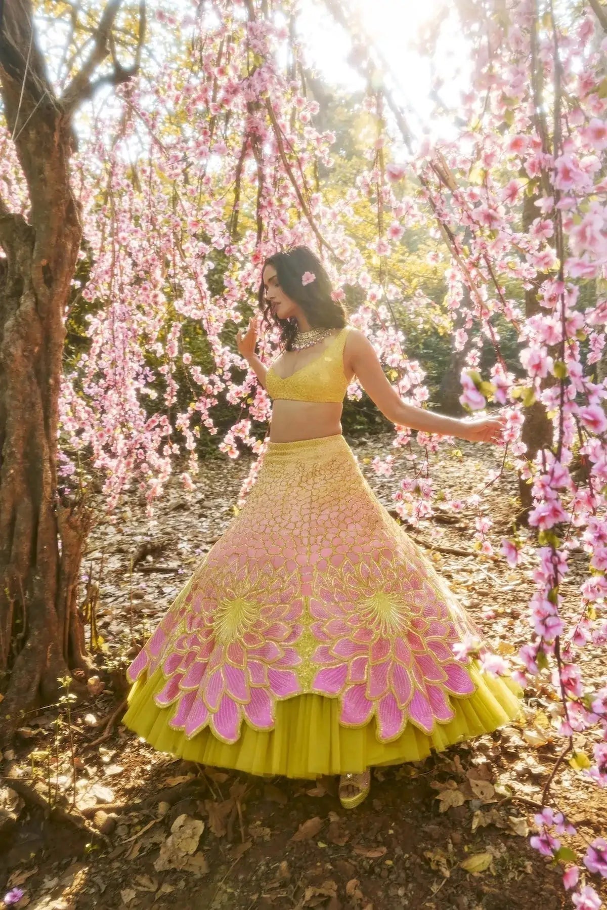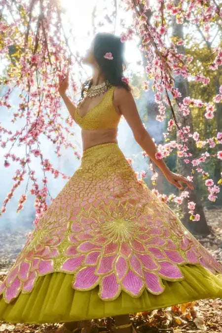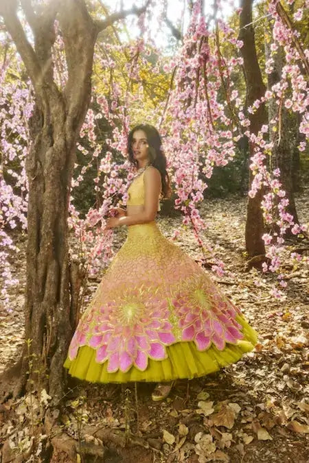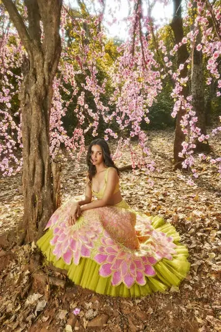 The Bloom Lehenga Set comes to life with petals unfolding like whispered secrets, while stones trace an enchanting journey from soft whispers to vibrant crescendos. Handmade in 1000+ hours, it evokes a dreamlike sensation with its natural shades.