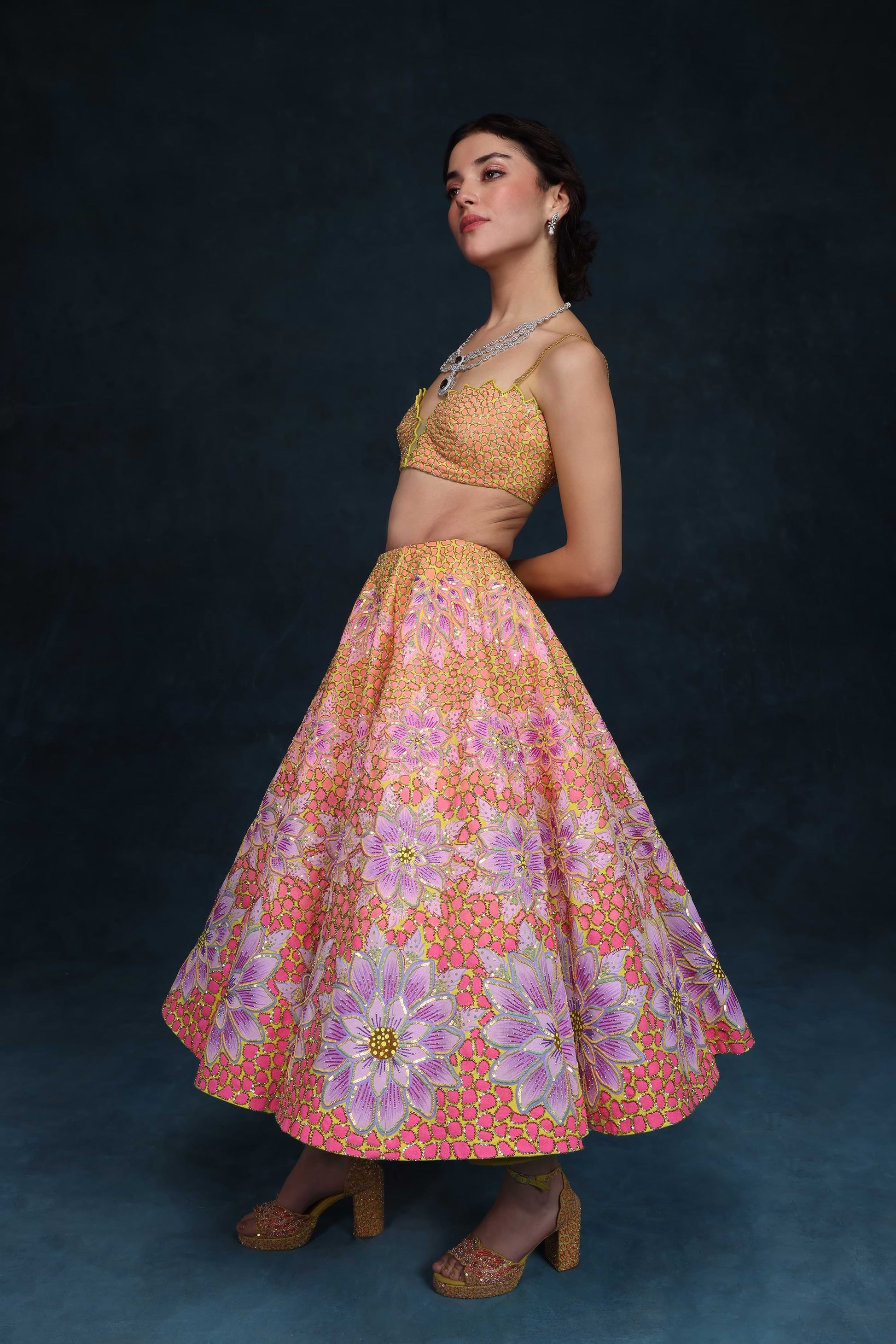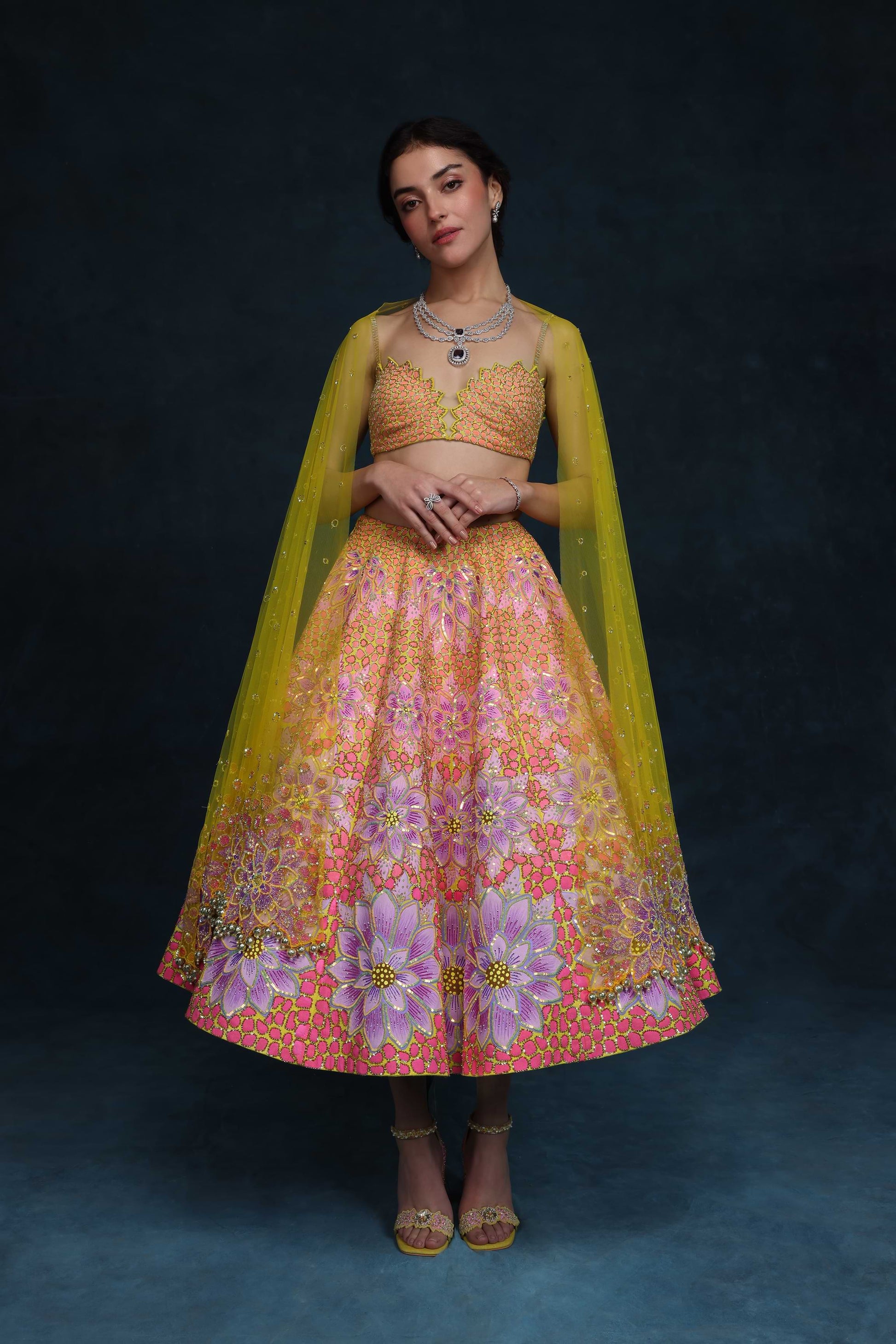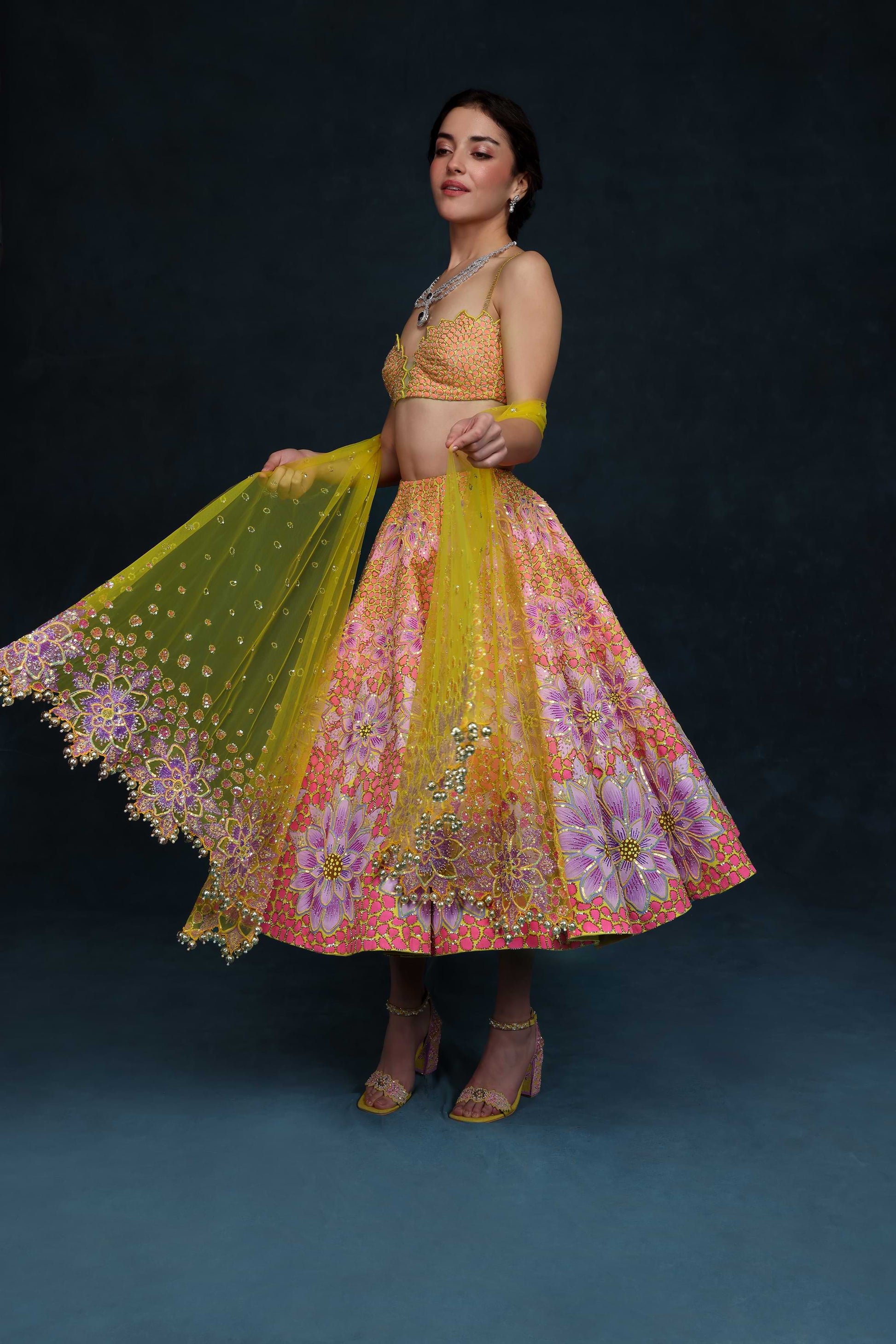 The Mohhar Blossom Lehenga showcases meticulous artistry, adorned with shaded flowers and sparkling stones in lush pink and orangish-peach tones. The blouse, adorned with golden beaded straps, complements a stylized dupatta that gracefully fades with nature’s finest elements, evoking the charm of a blossoming garden.
