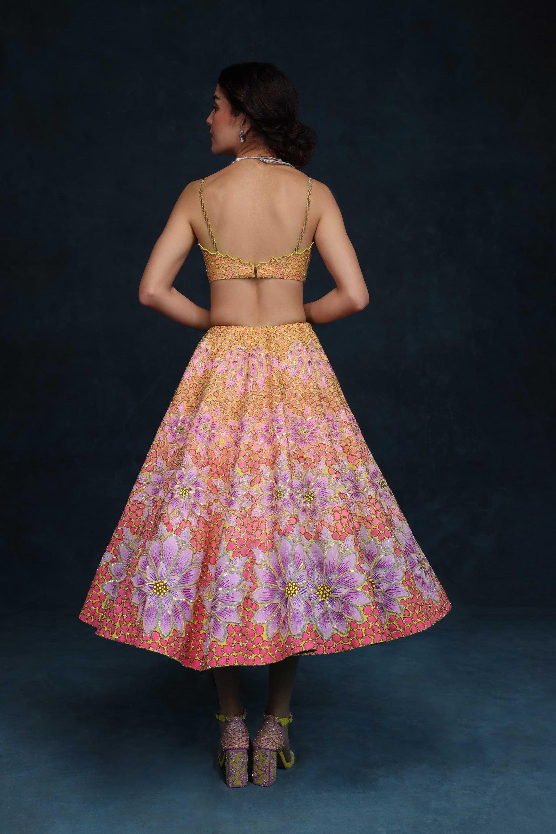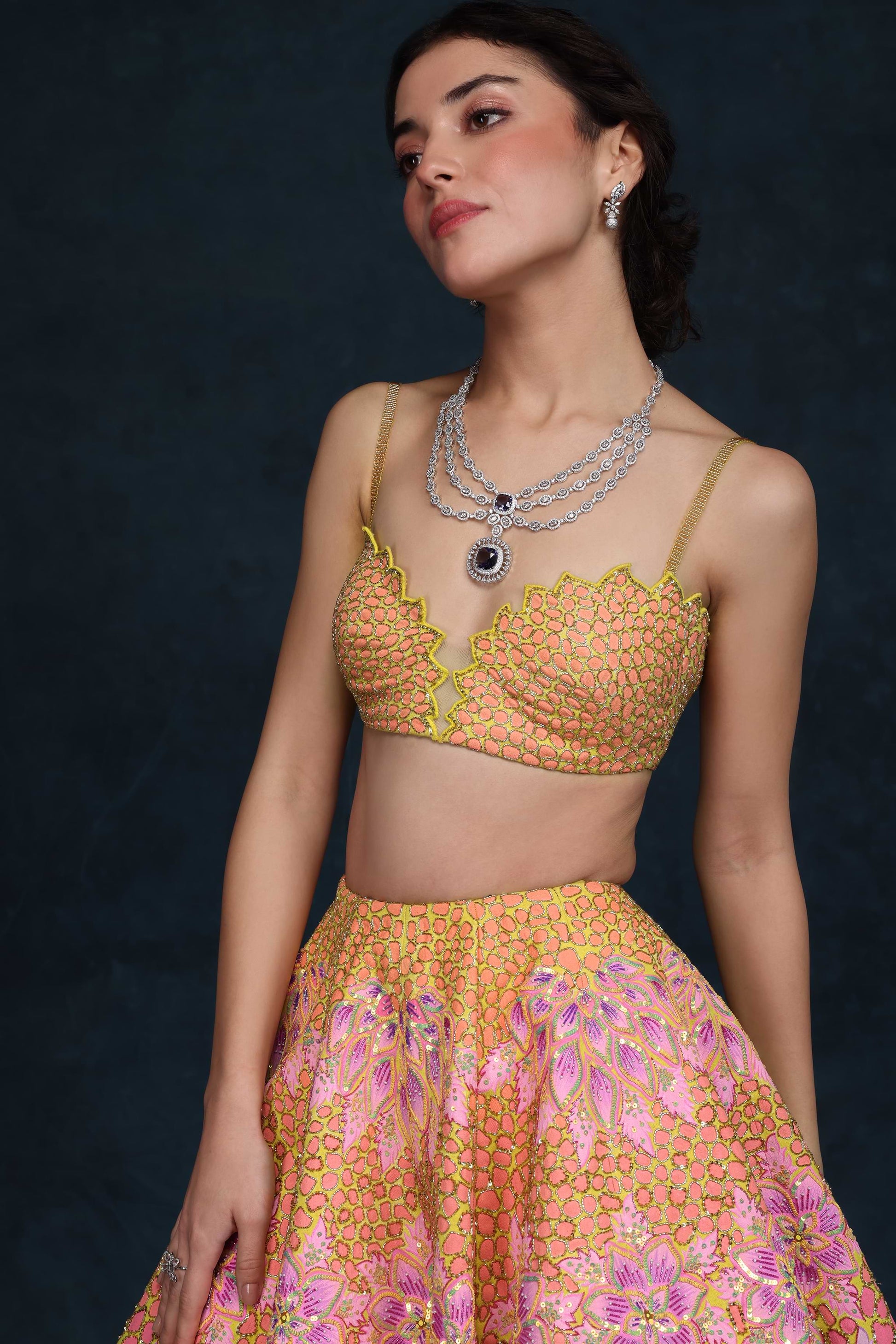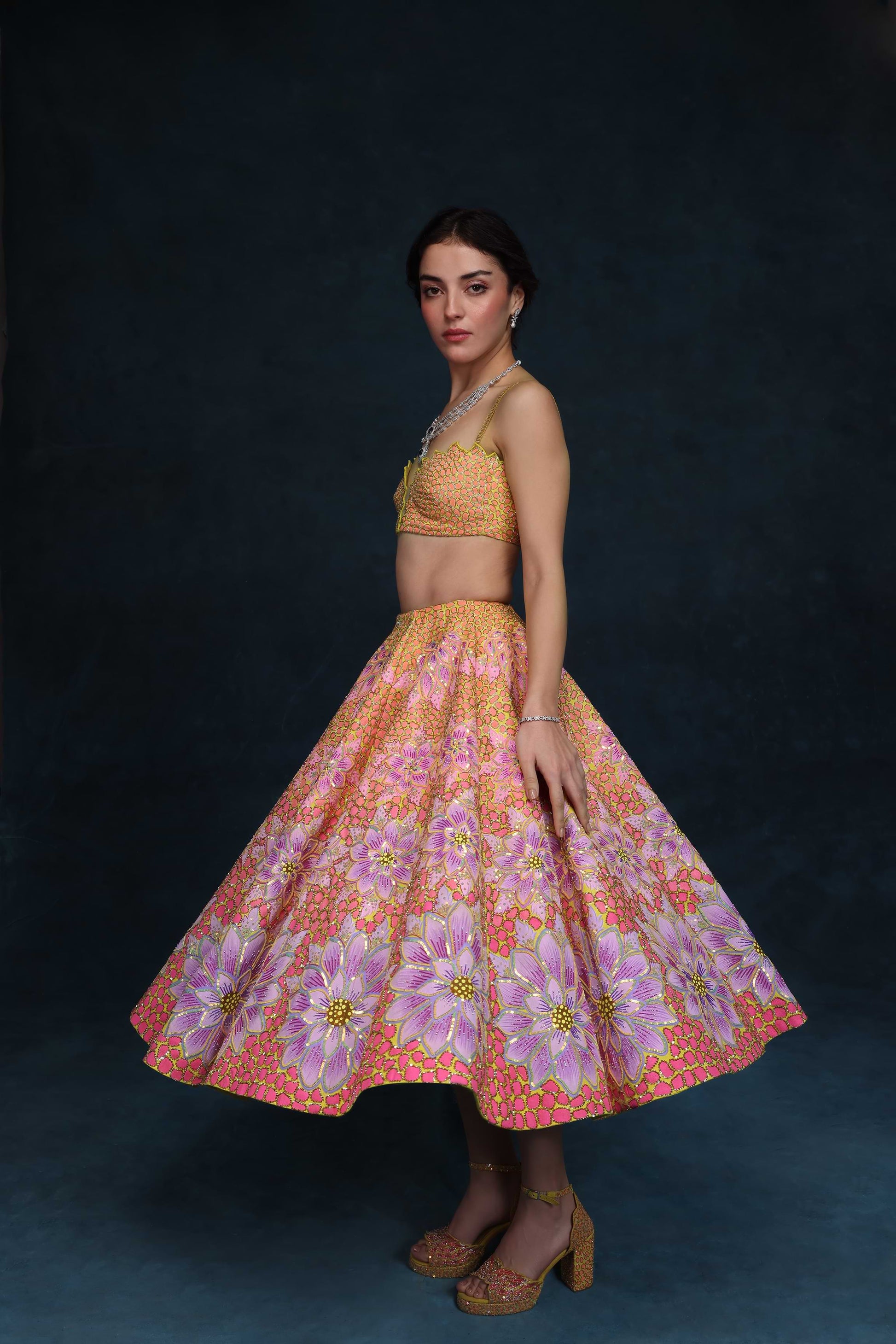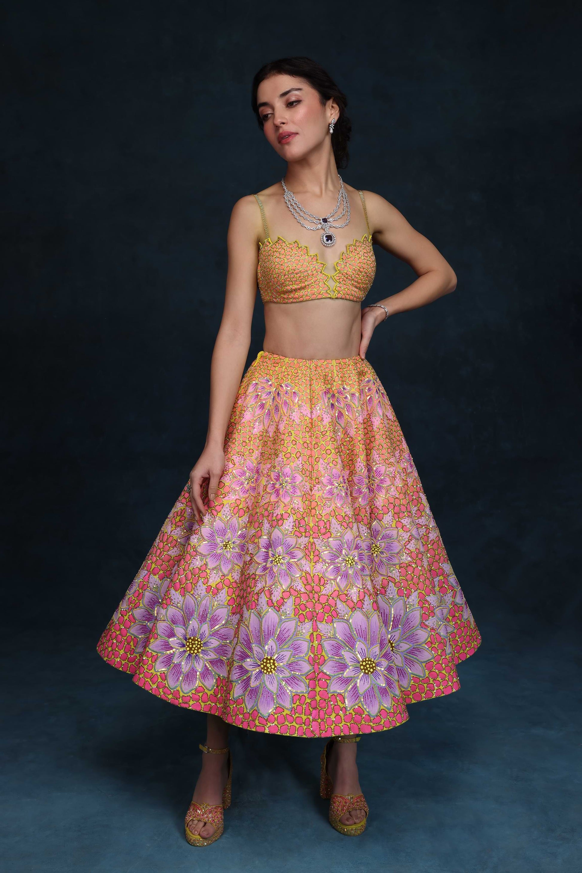 The Mohhar Blossom Lehenga showcases meticulous artistry, adorned with shaded flowers and sparkling stones in lush pink and orangish-peach tones. The blouse, adorned with golden beaded straps, complements a stylized dupatta that gracefully fades with nature’s finest elements, evoking the charm of a blossoming garden.