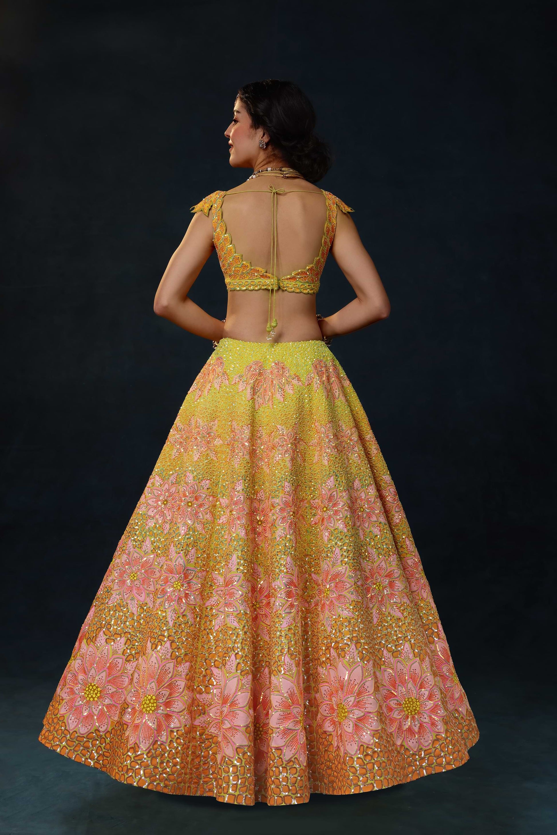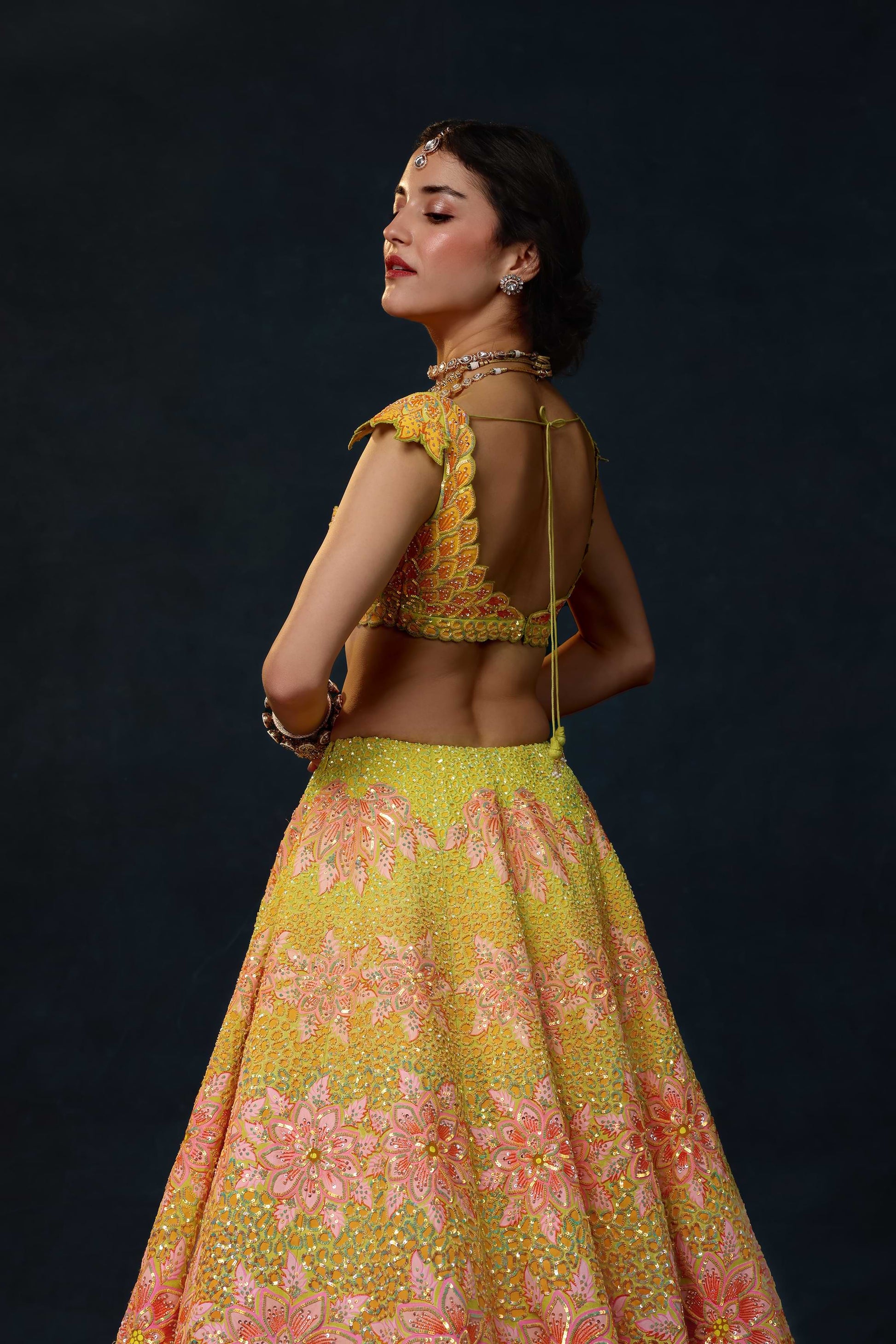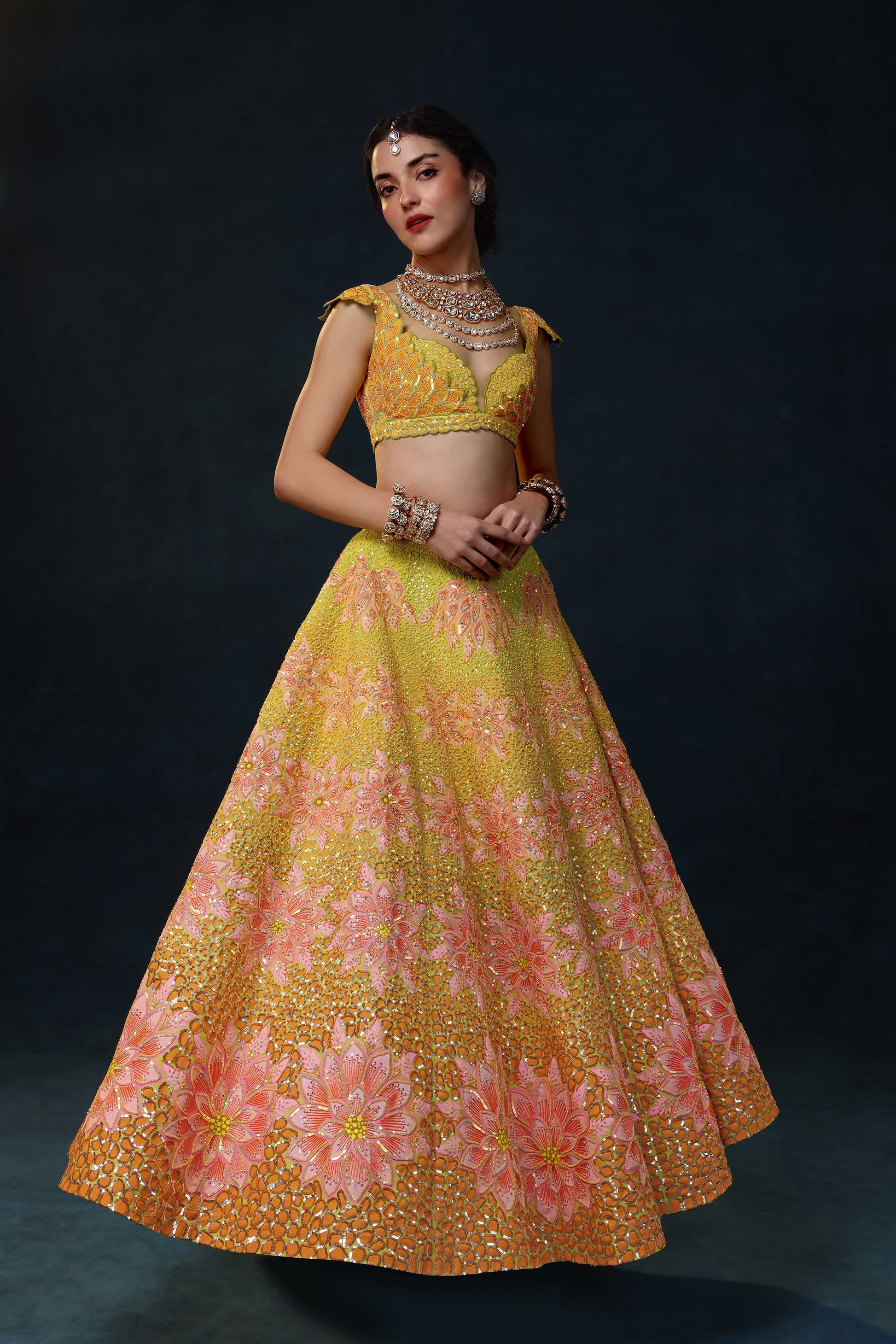 The Mohhar Laranja Bloom Lehenga, adorned with blooming flowers and an ombre of stones from dusty orange at the hem to greenish-gold at the waist, features a unique blouse with leaf motif around with stone work creating a golden presence.