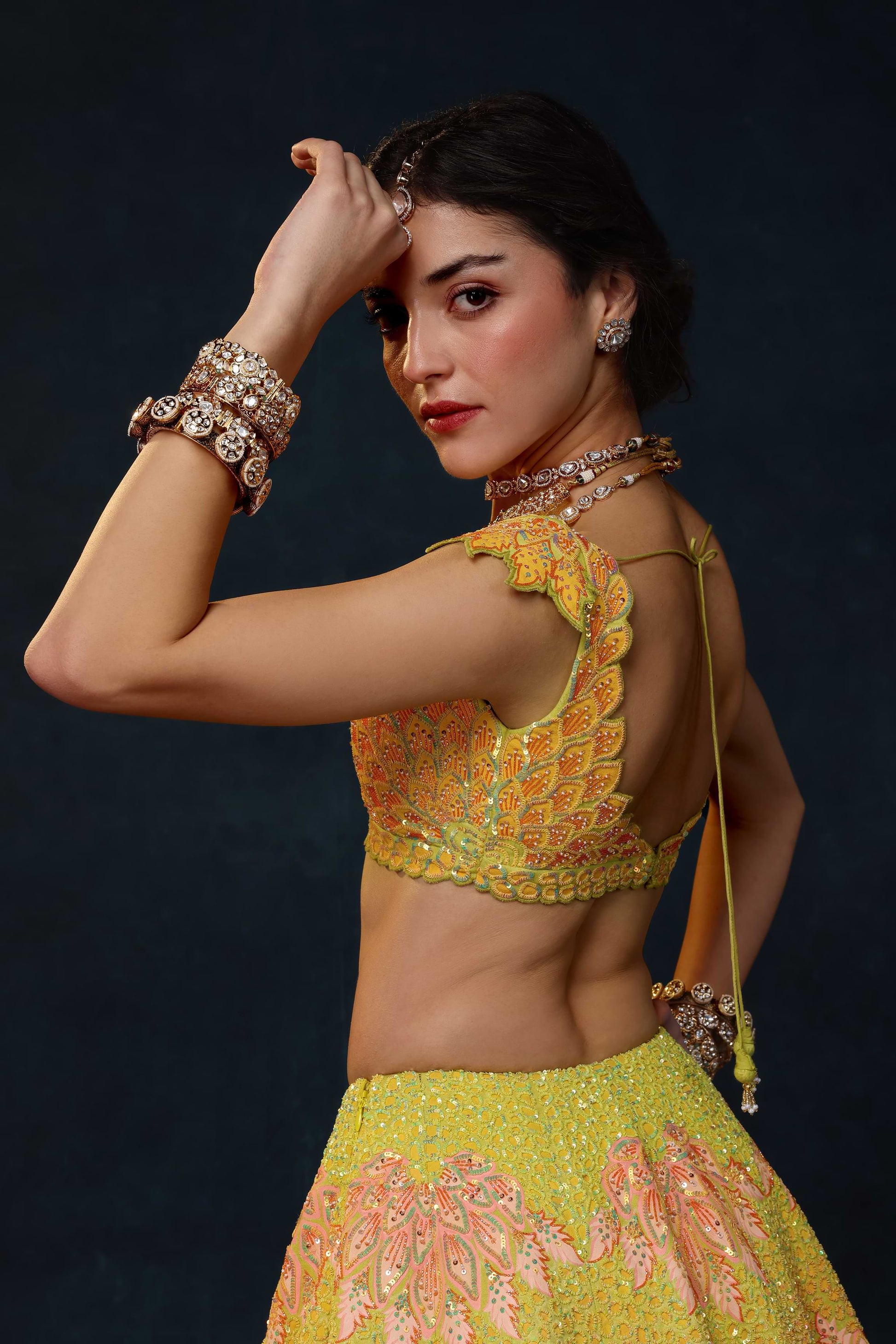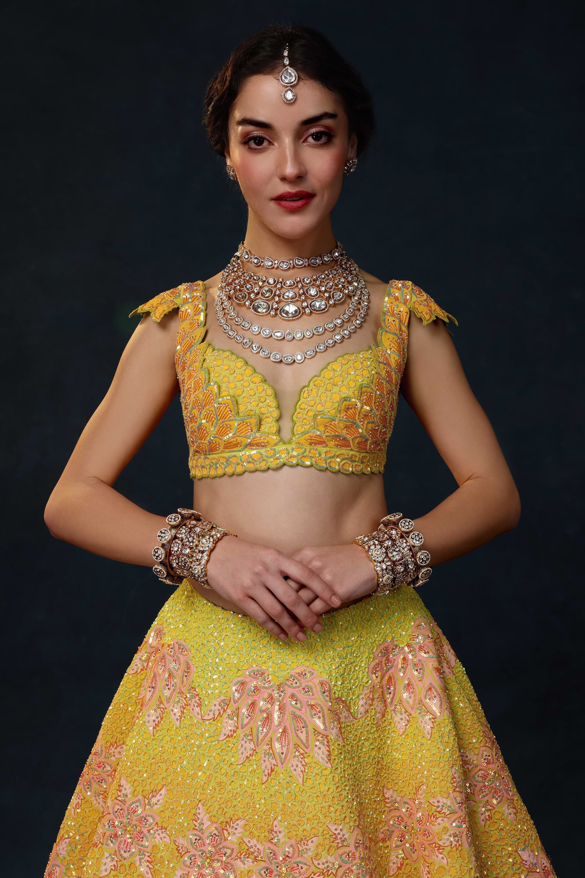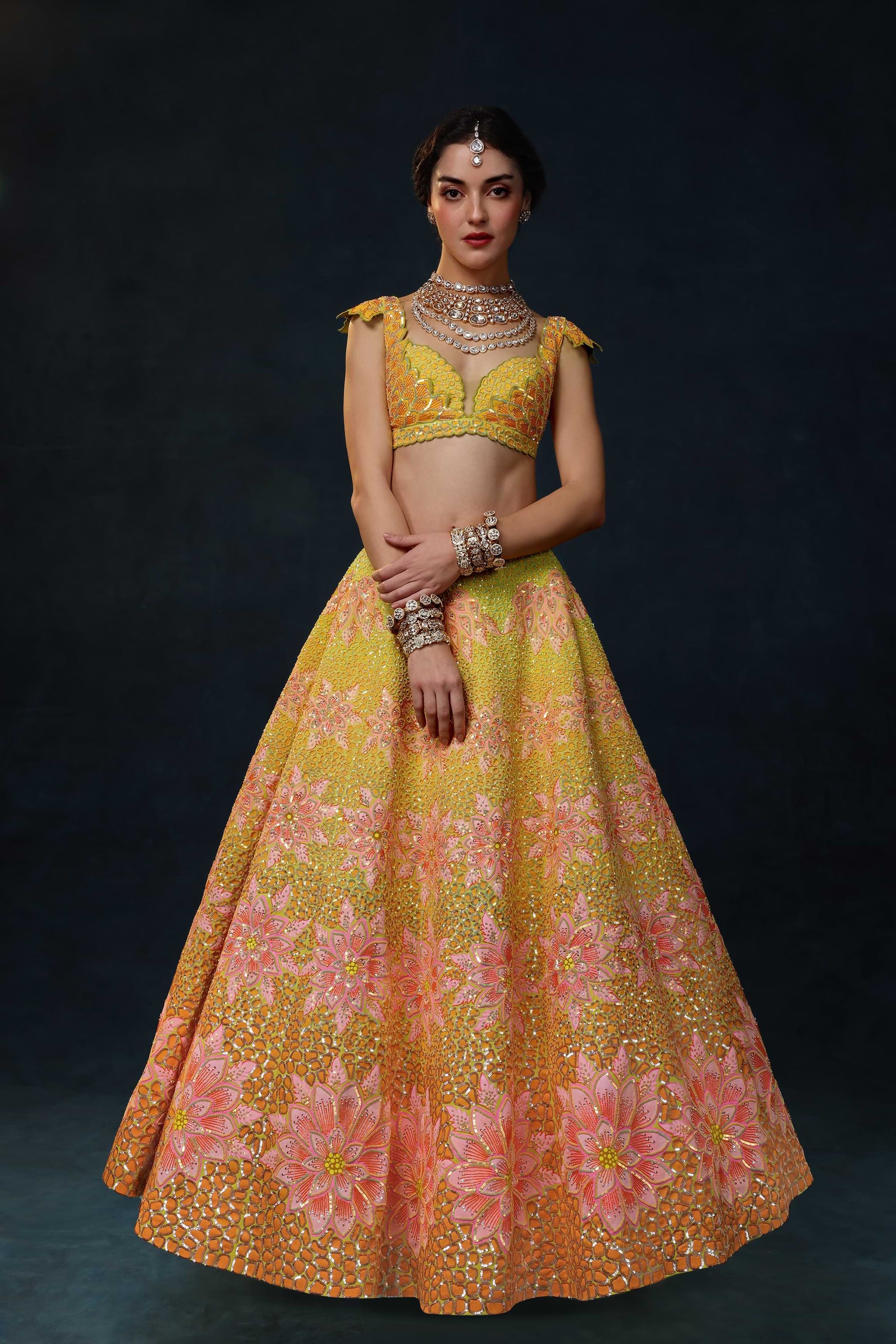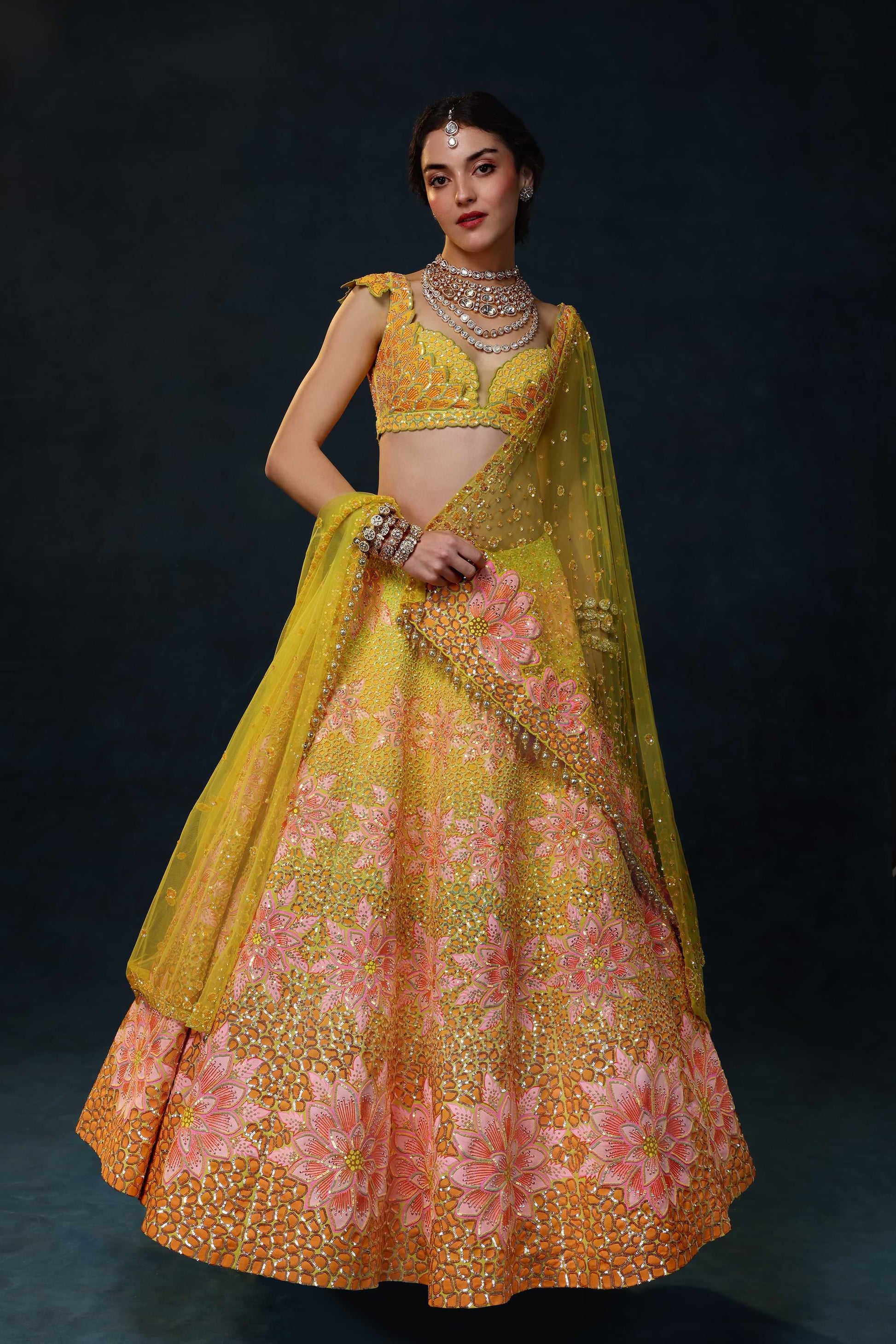The Mohhar Laranja Bloom Lehenga, adorned with blooming flowers and an ombre of stones from dusty orange at the hem to greenish-gold at the waist, features a unique blouse with leaf motif around with stone work creating a golden presence.
