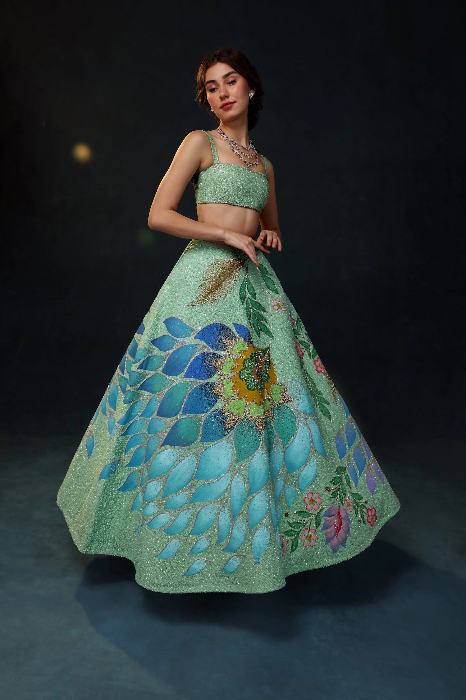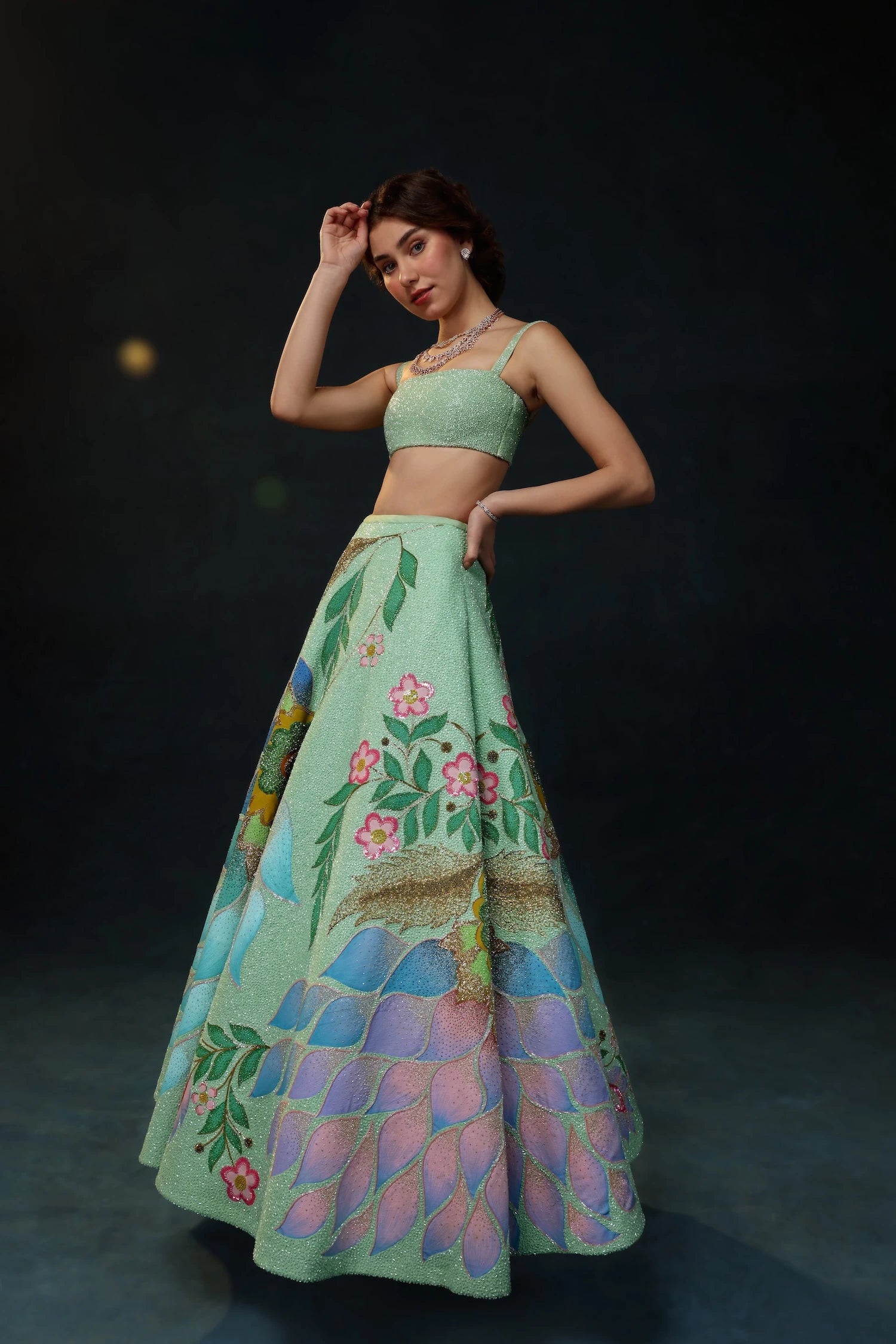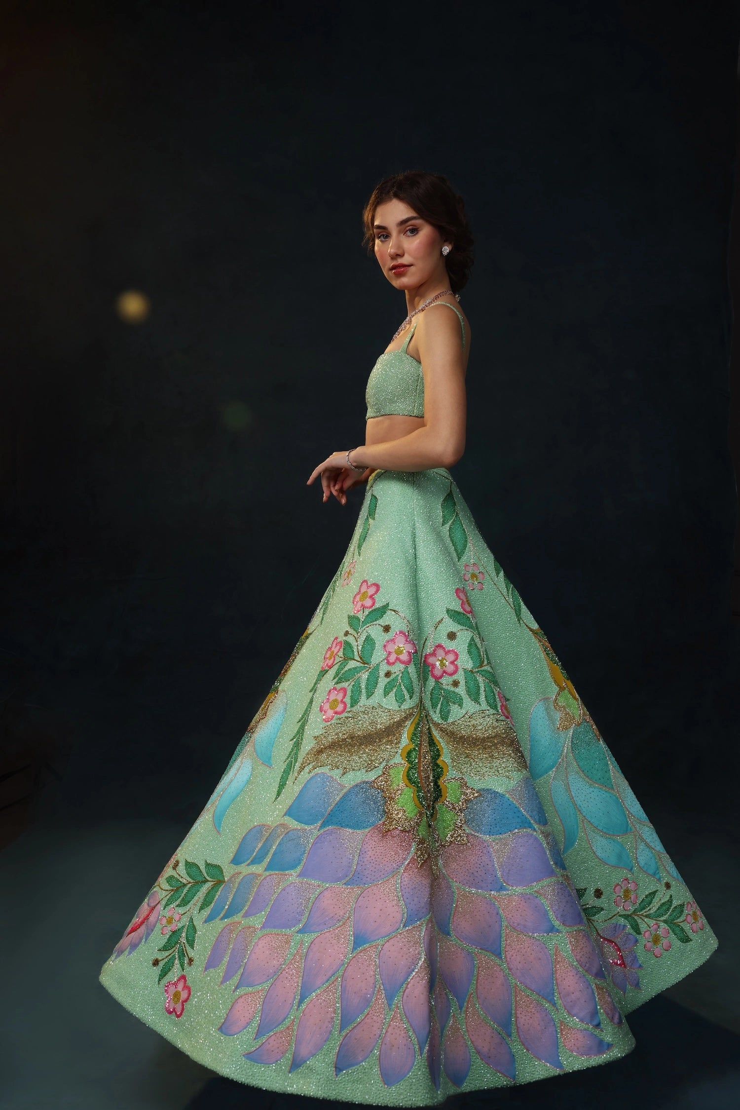 From the sway of underwater gardens to the light dancing on ocean waves; hand-drawn florals, delicate embroidery, and flowing textures come together to embrace singular beauty in every detail of the Oceana Lehenga