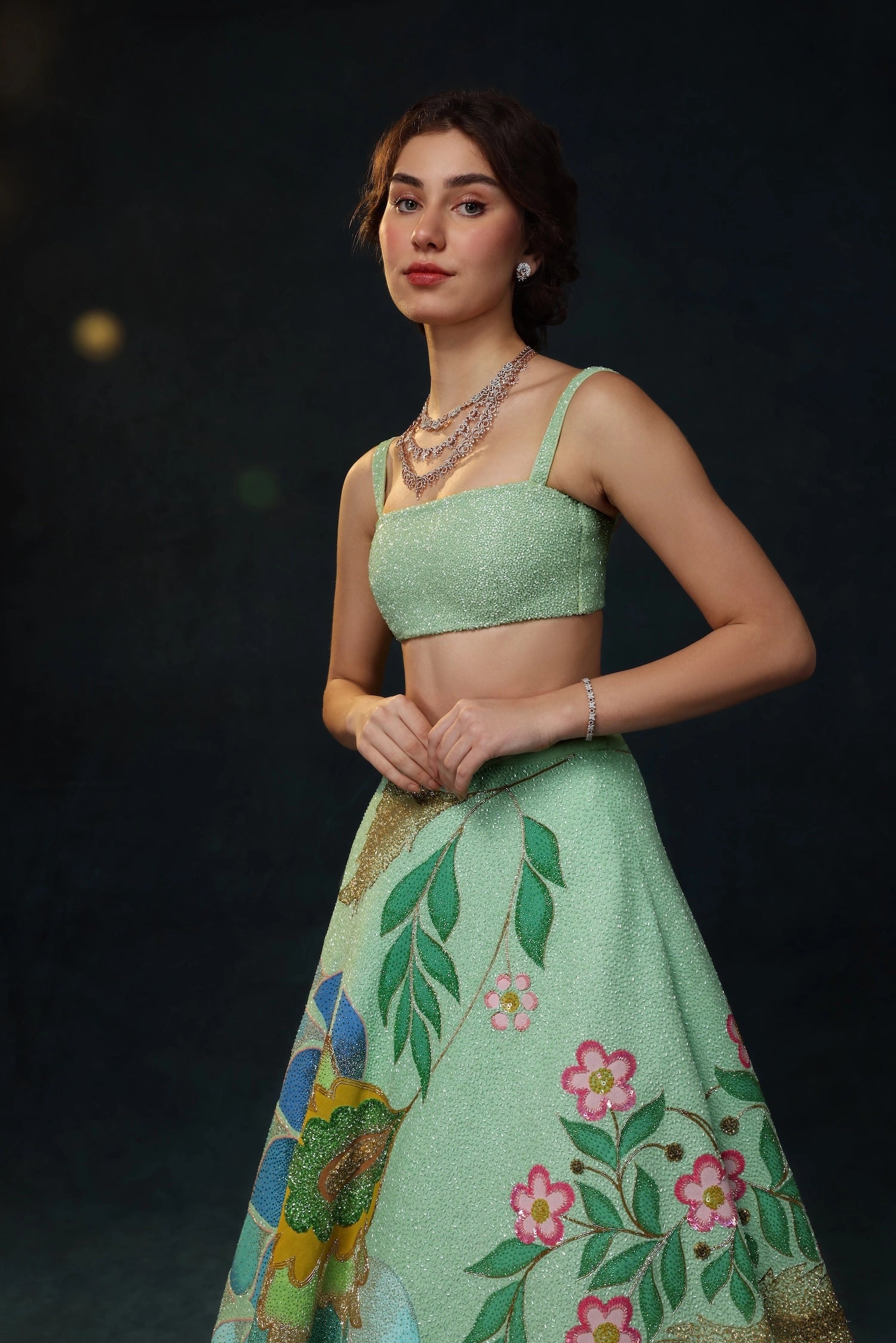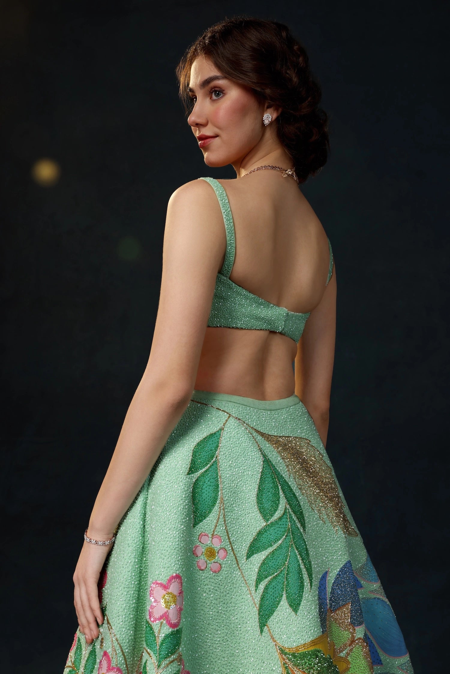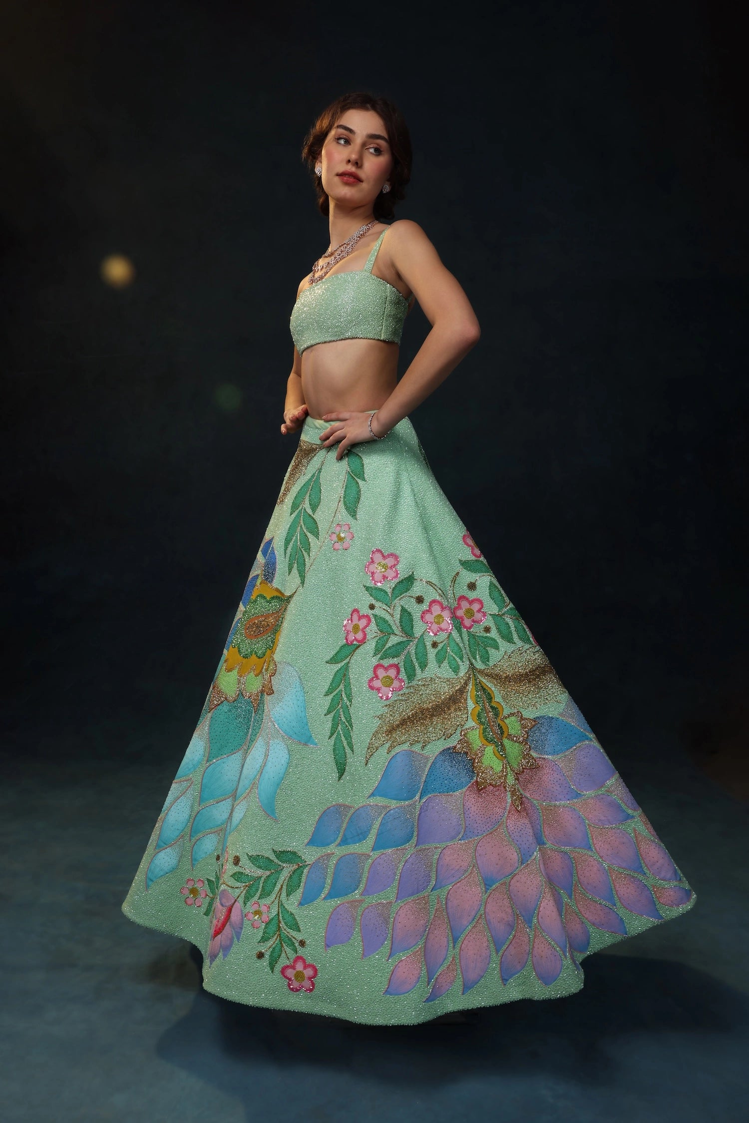 From the sway of underwater gardens to the light dancing on ocean waves; hand-drawn florals, delicate embroidery, and flowing textures come together to embrace singular beauty in every detail of the Oceana Lehenga