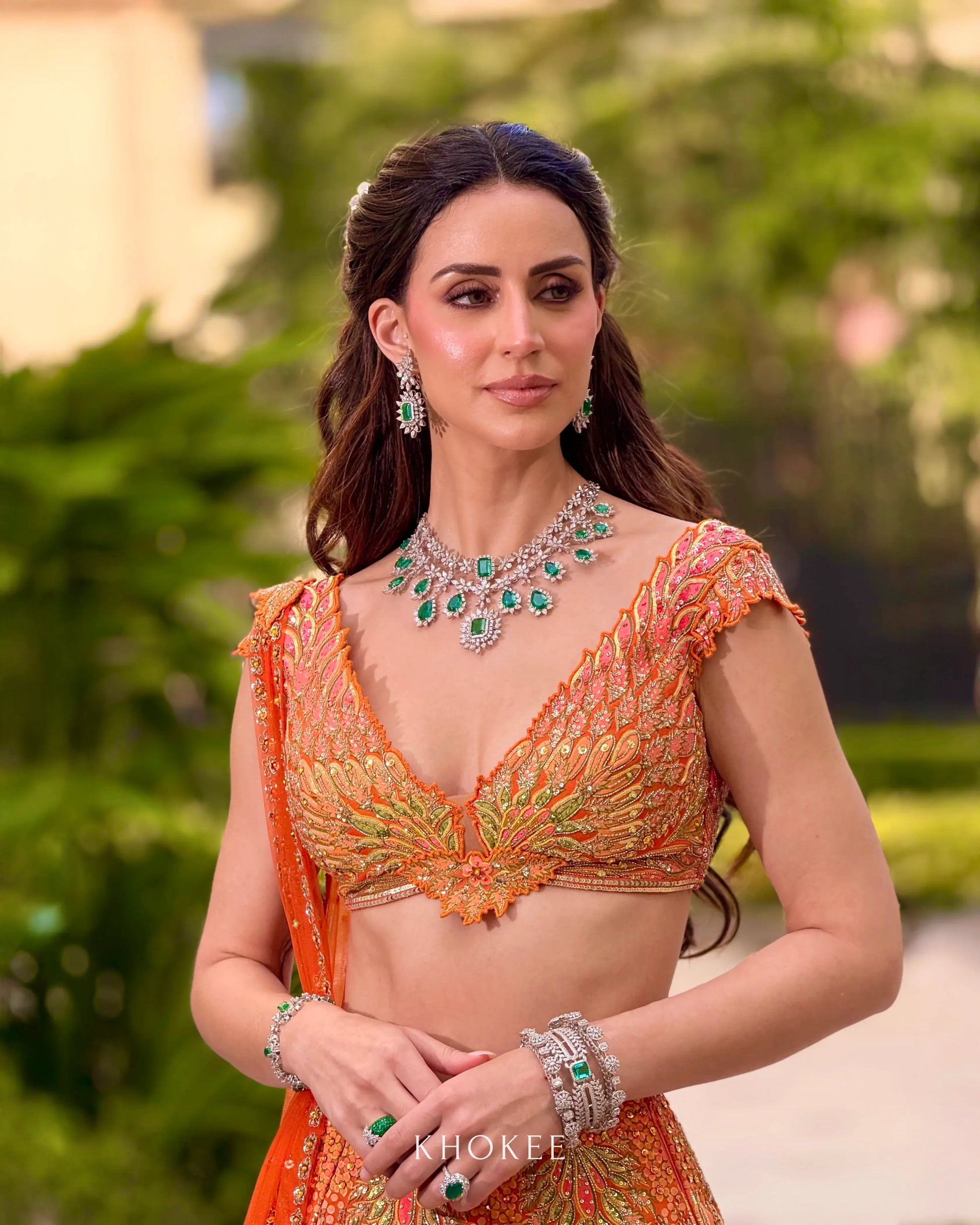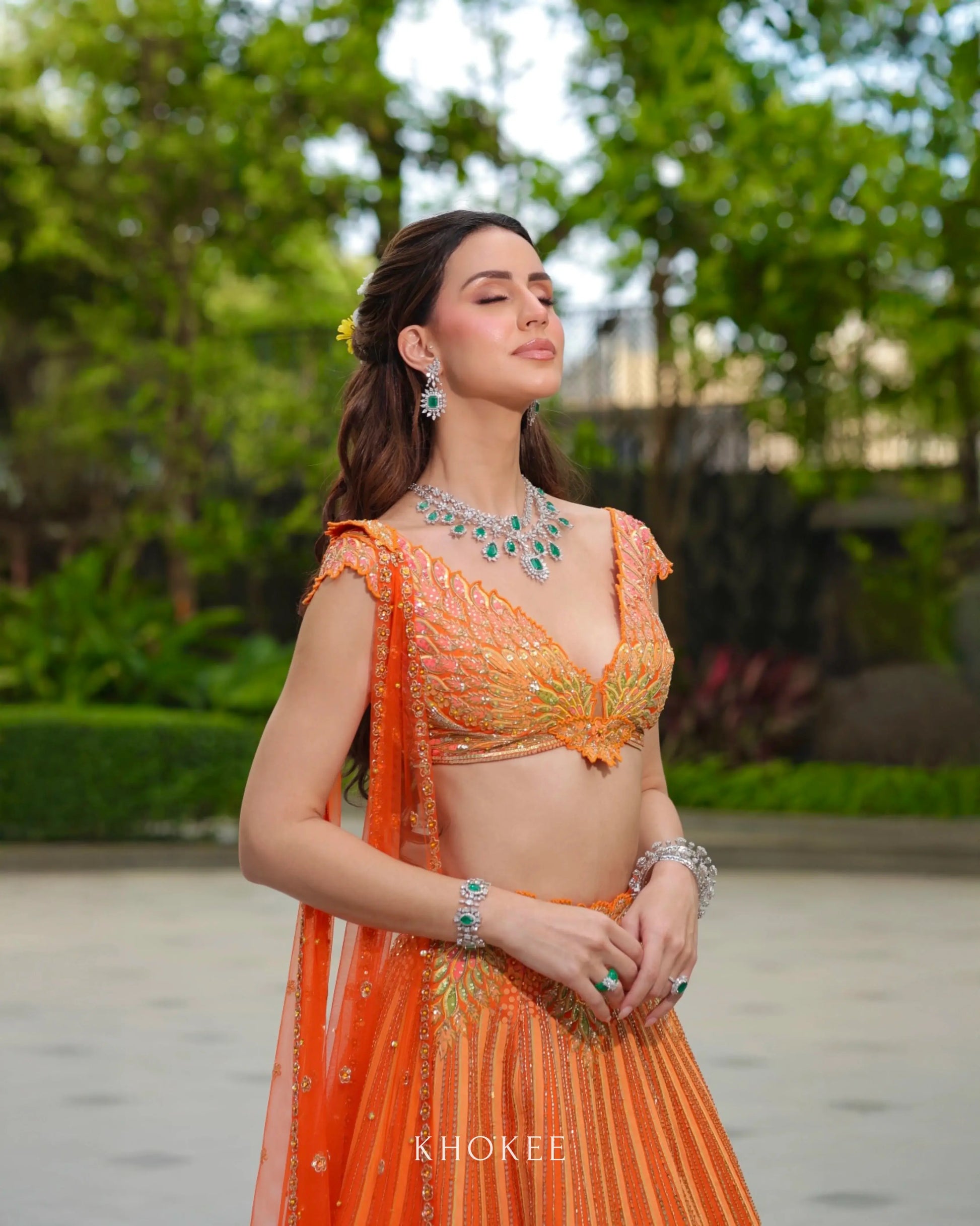 Handcrafted with petals, the Flora Lehenga unfurls the essence of a flower in full bloom. Blush hues and green tones come together like a breath of fresh air, reflecting nature's artistry.