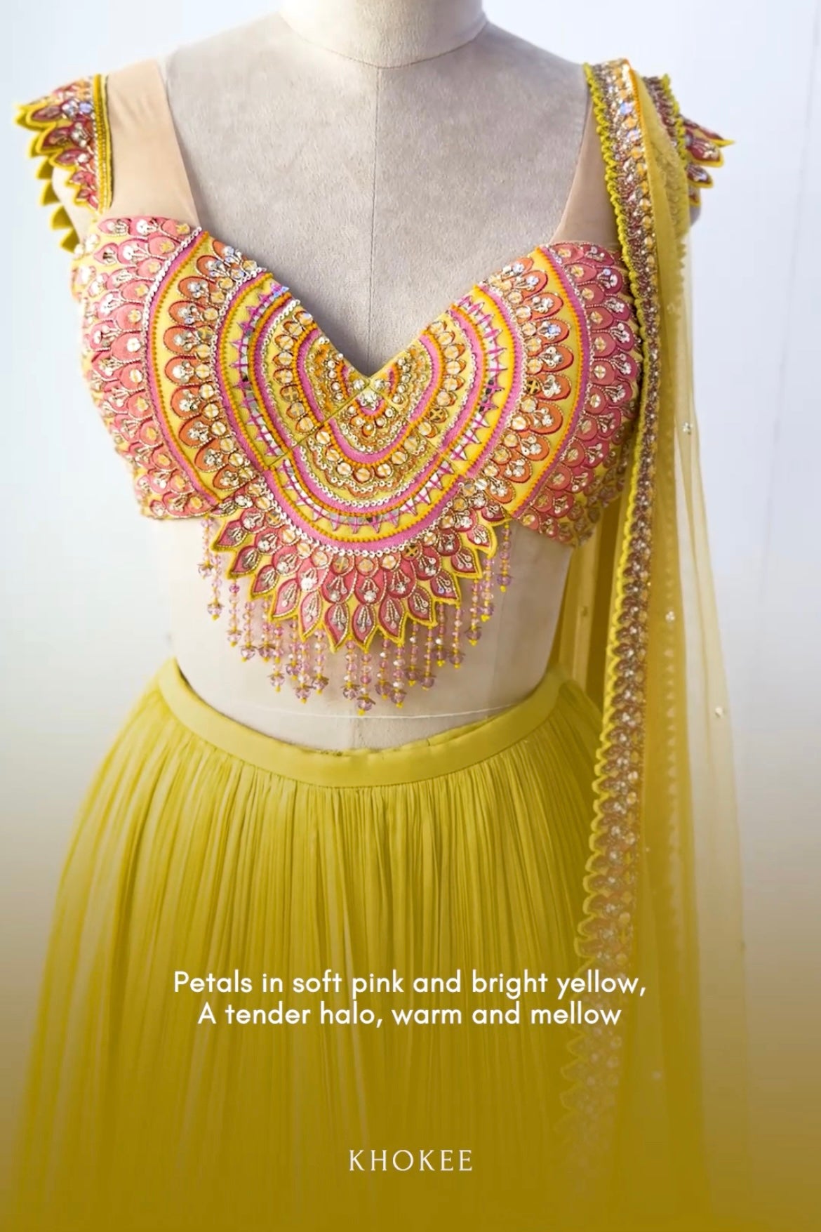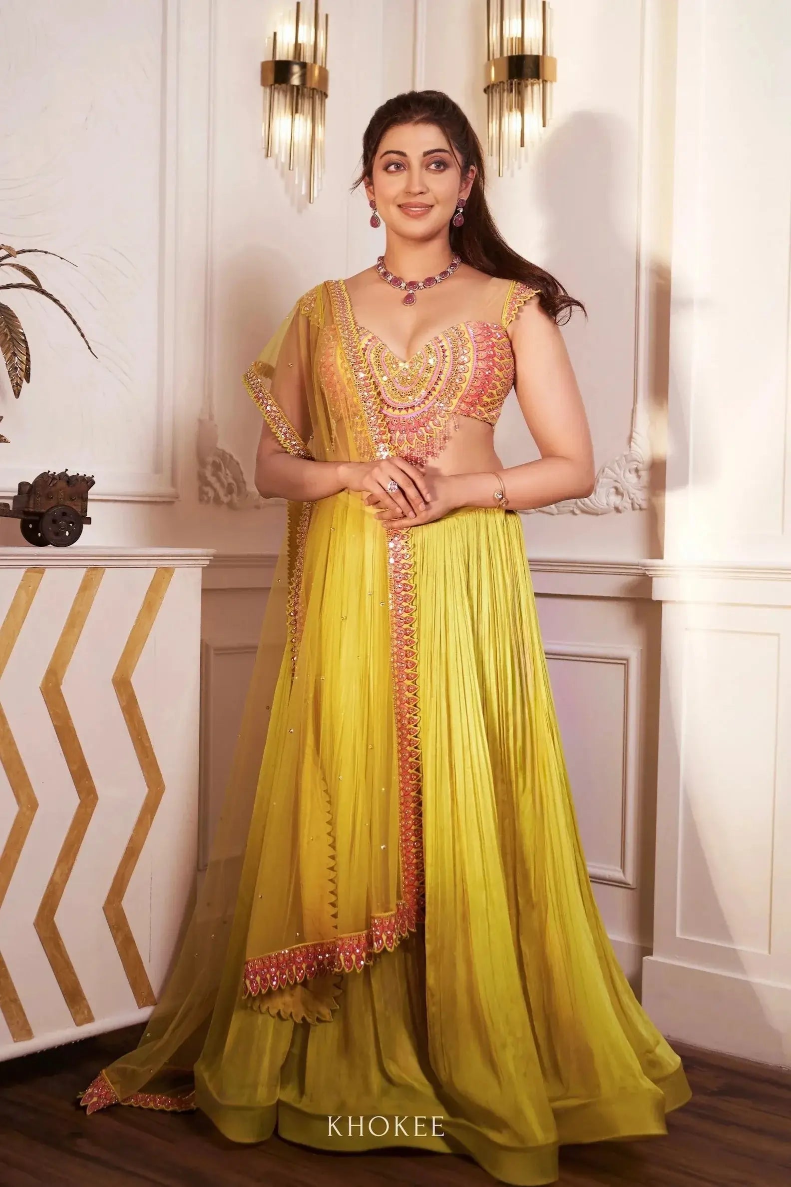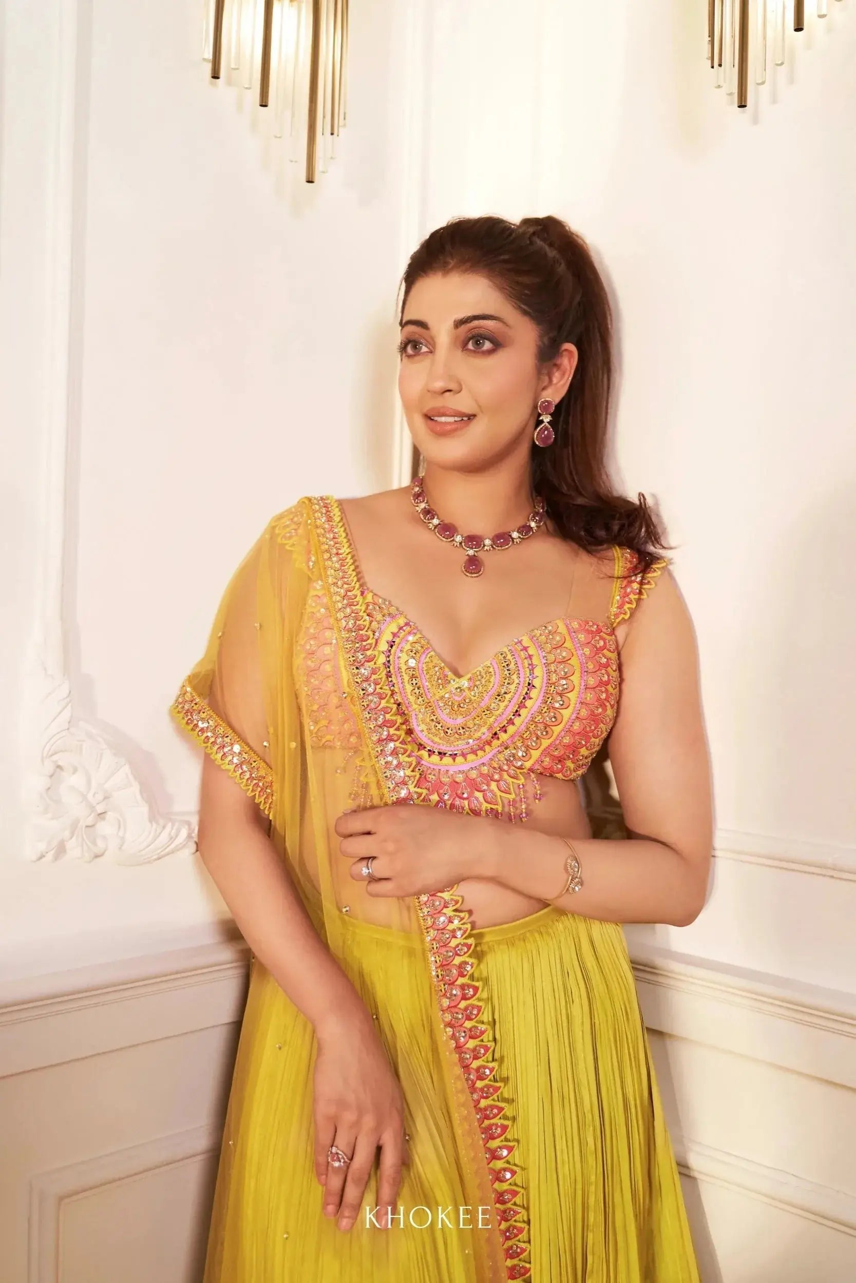 Pranitha Subhash wearing Khokee’s iconic short flap blouse, reminiscent of the bold and lively essence of zinnia flowers in full bloom, adorned with flowing leaf motifs in vibrant orange, pink and yellow.