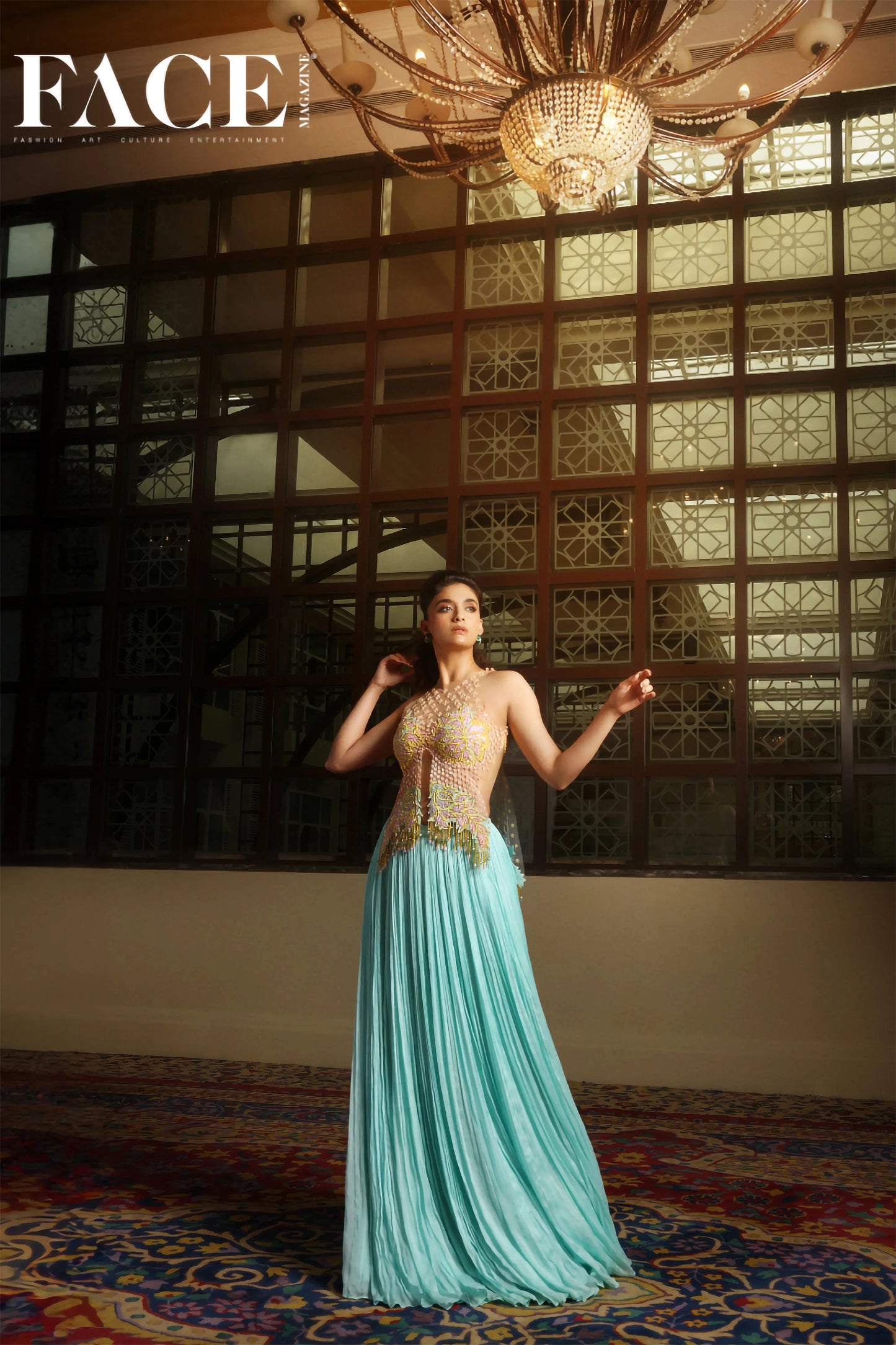 Keerthy Suresh in our signature, Ratnakara Flap Lehenga Set. Inspired by the ocean’s soft whispers in shades of blue, blush pinks and purples, the Ratnakara Lehenga traces a journey of artisanal craft and innovation.