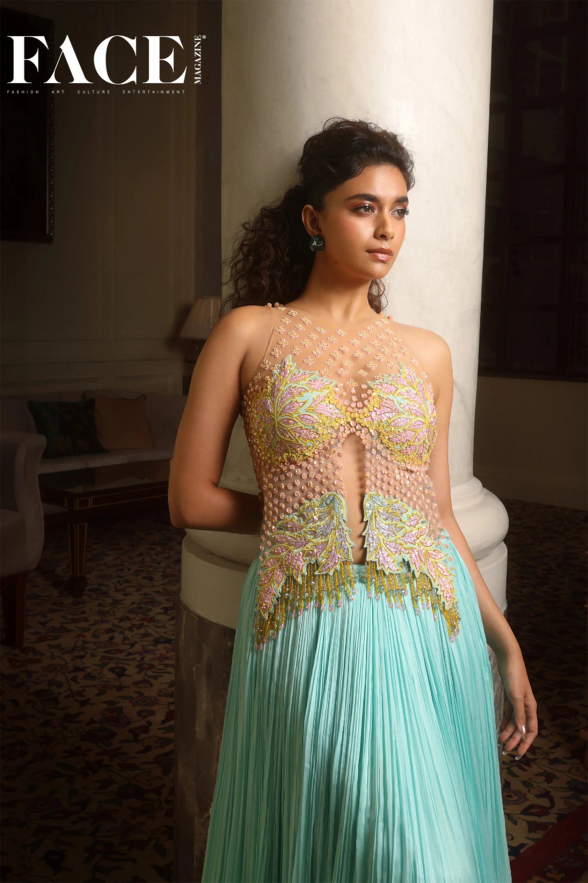 Keerthy Suresh in our signature, Ratnakara Flap Lehenga Set. Inspired by the ocean’s soft whispers in shades of blue, blush pinks and purples, the Ratnakara Lehenga traces a journey of artisanal craft and innovation.