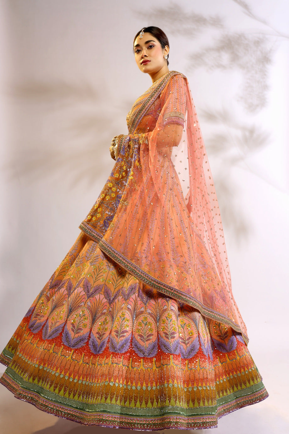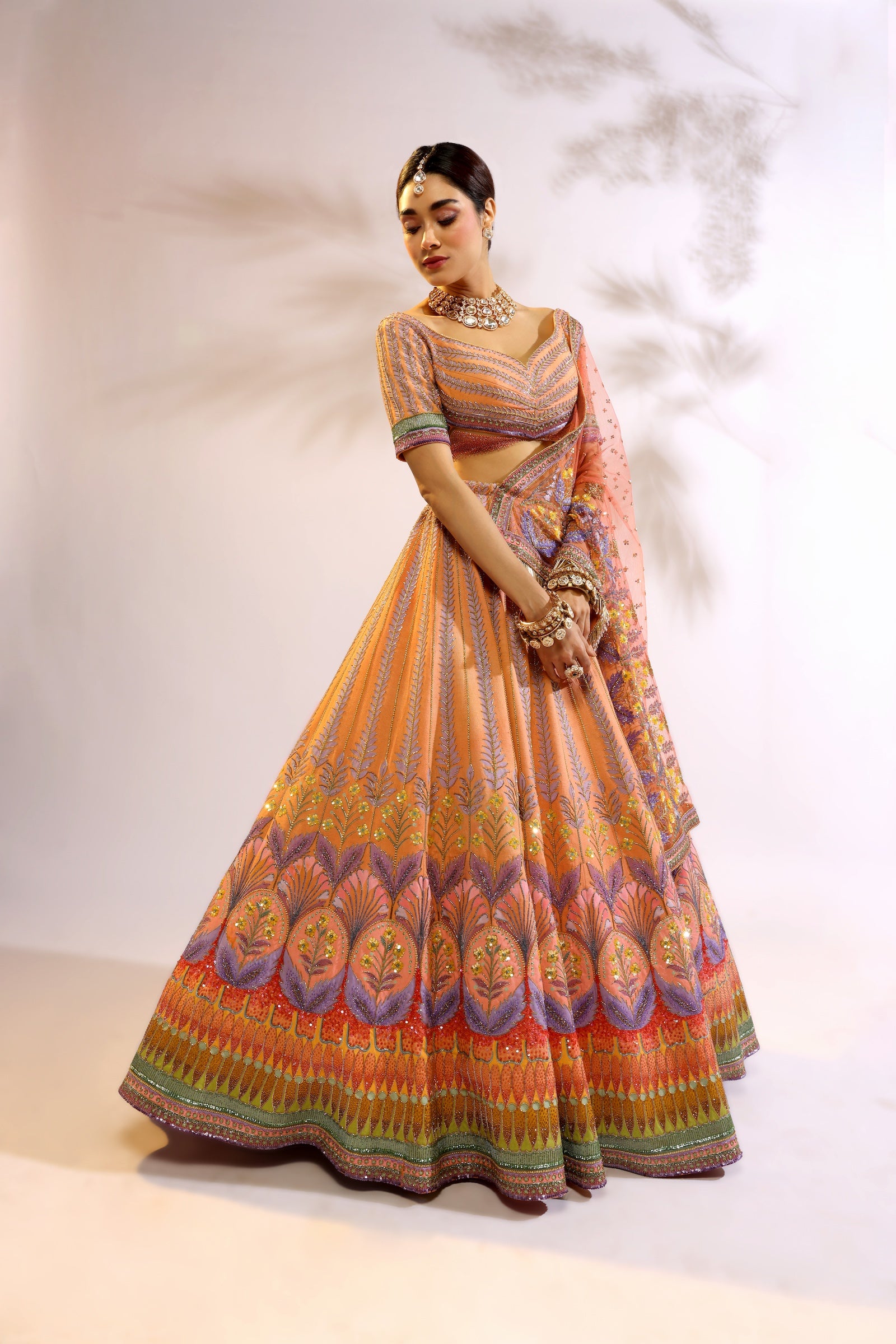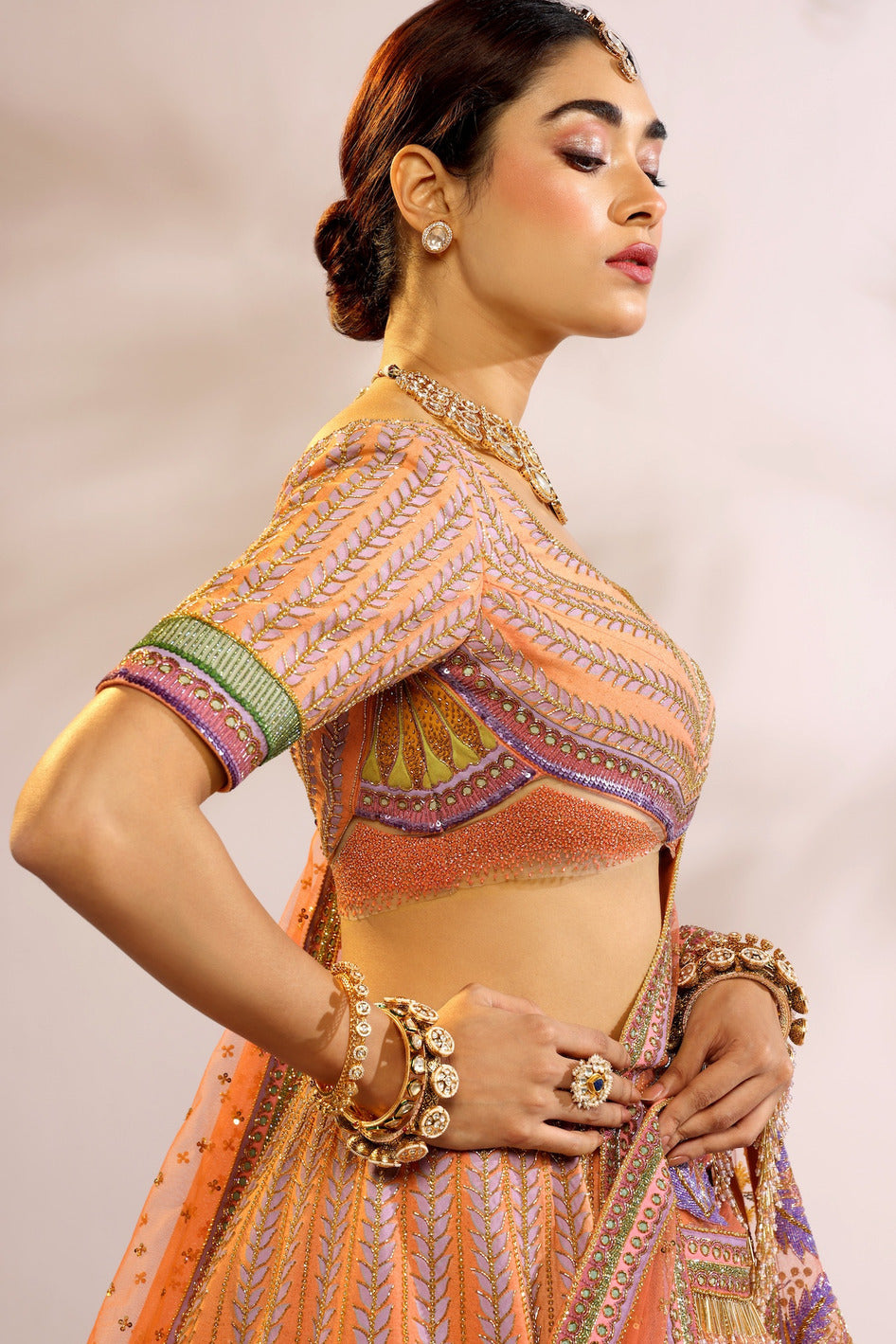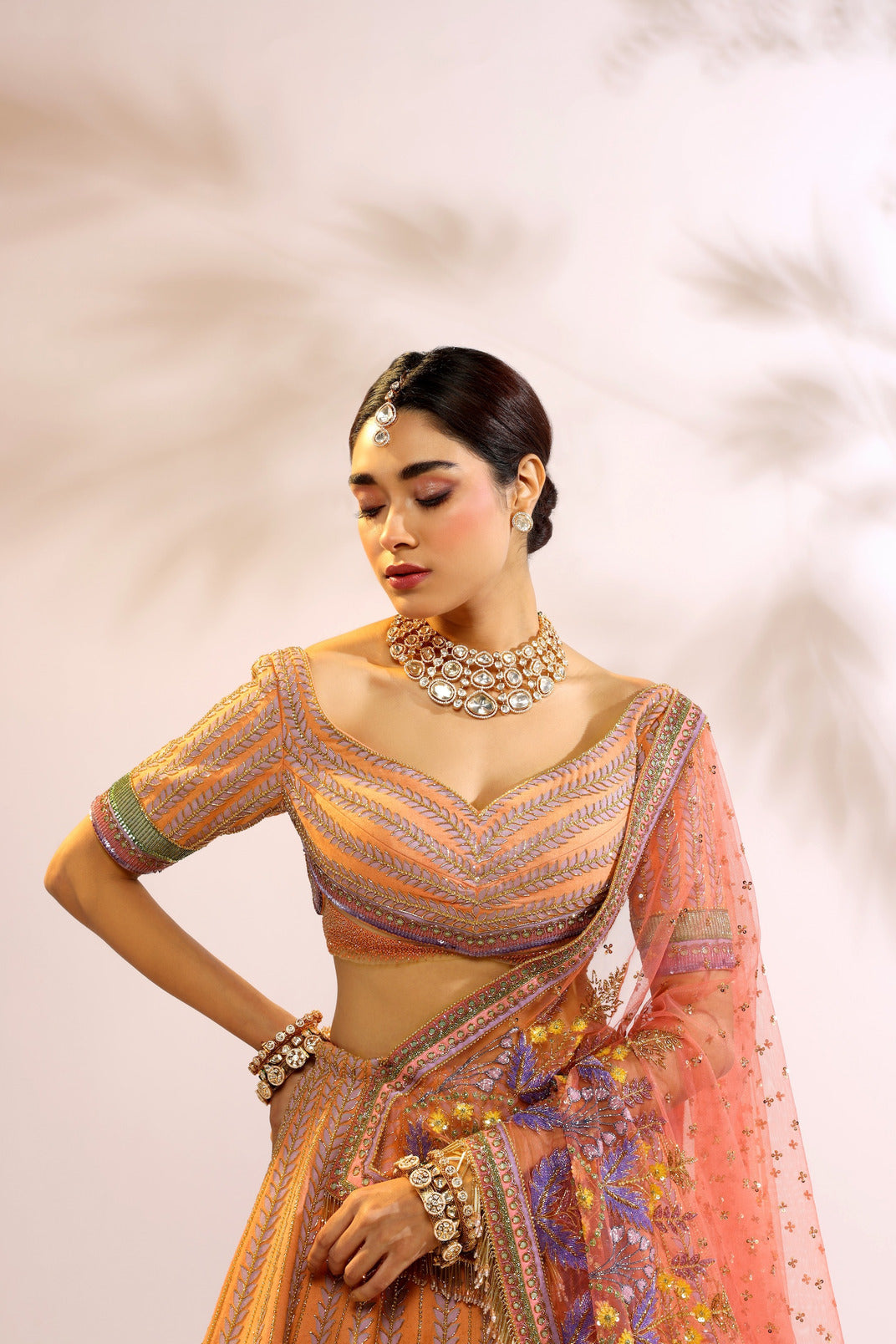The Sakhpushp Lehenga Set, is adorned with intricate floral motifs that celebrate the beauty of nature. Each motif delicately mirrors blooming flowers, swaying leaves, and graceful stems. The blouse, elegantly detailed at the sides, harmonises with a shimmering, hand-embroidered floral dupatta.