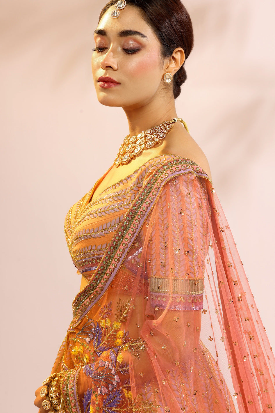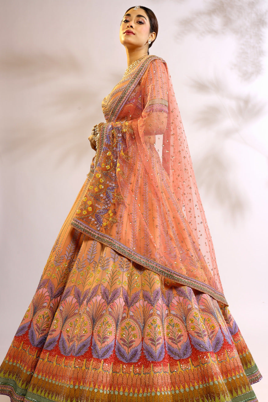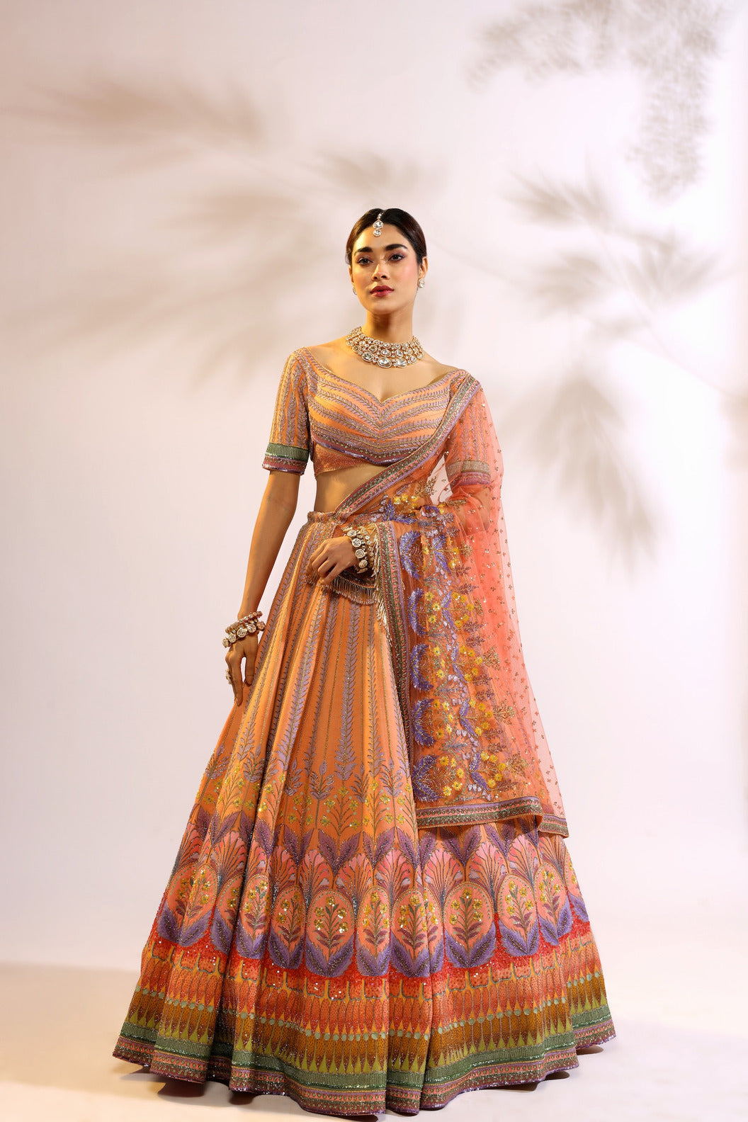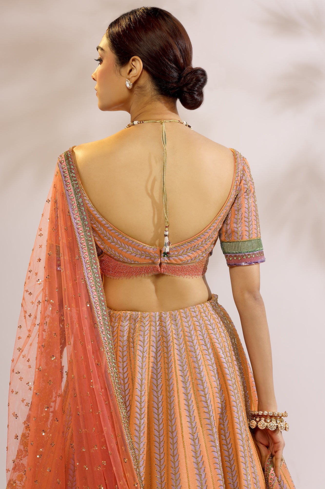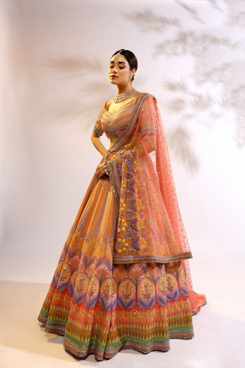 The Sakhpushp Lehenga Set, is adorned with intricate floral motifs that celebrate the beauty of nature. Each motif delicately mirrors blooming flowers, swaying leaves, and graceful stems. The blouse, elegantly detailed at the sides, harmonises with a shimmering, hand-embroidered floral dupatta.