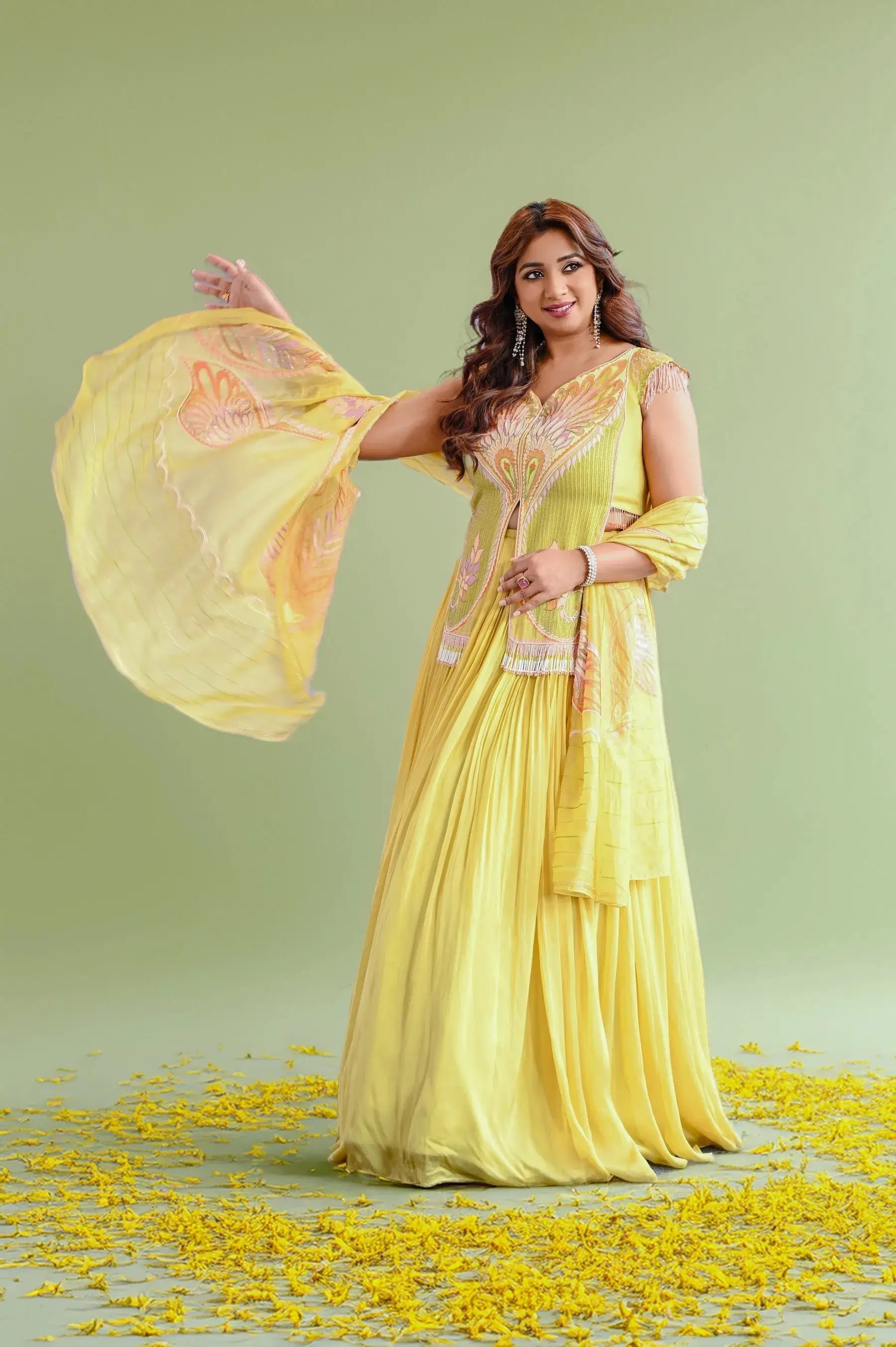 The legendary Shreya Ghoshal in Khokee’s signature, the Keri Lehenga Set, featuring an innovative cut of the flap blouse, complemented by whimsical hand-sewn tassels, giving a beautiful, dainty look.