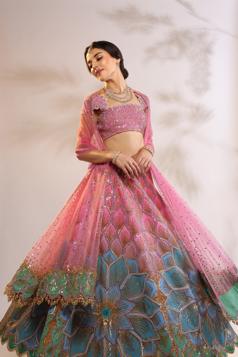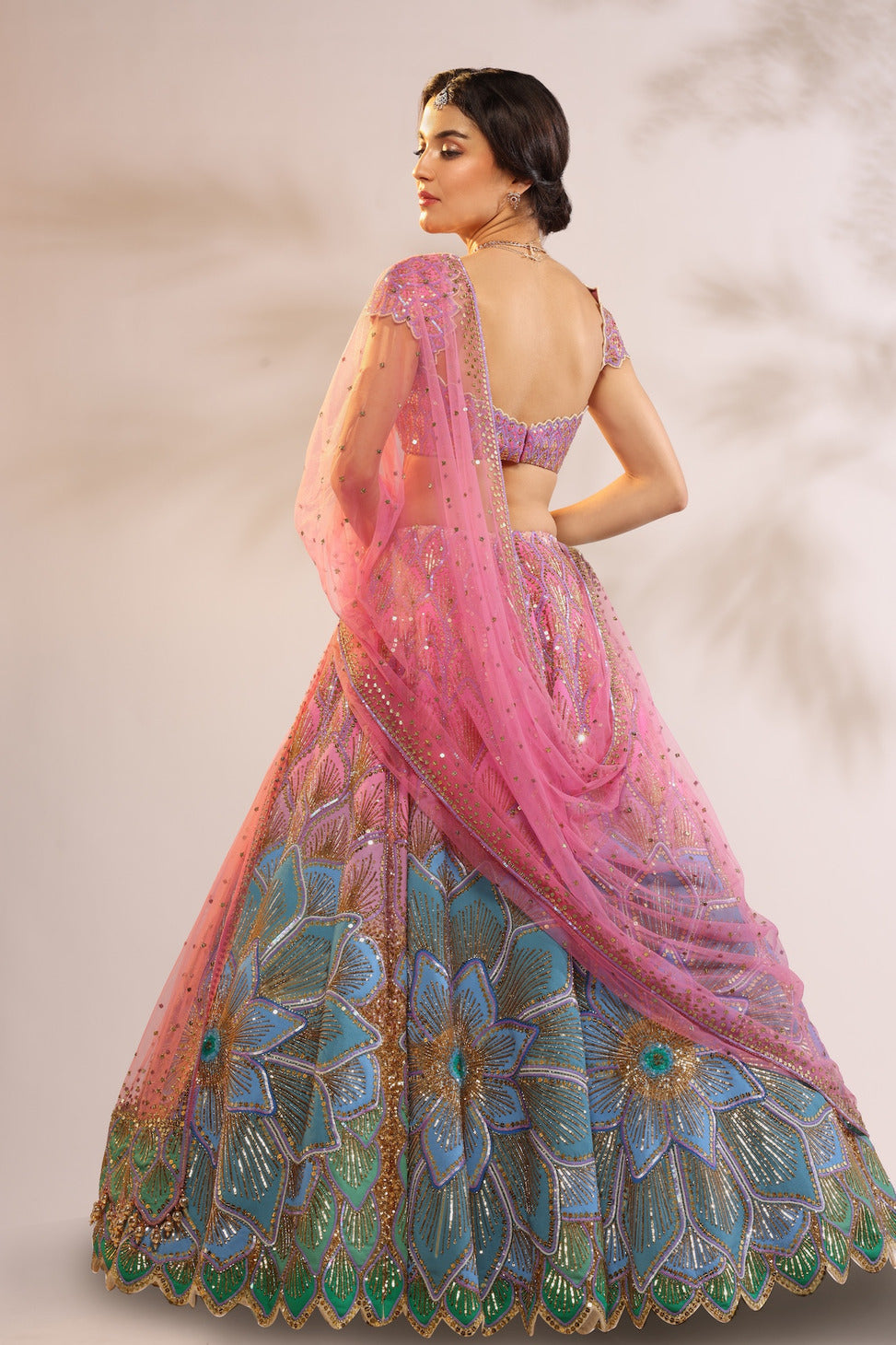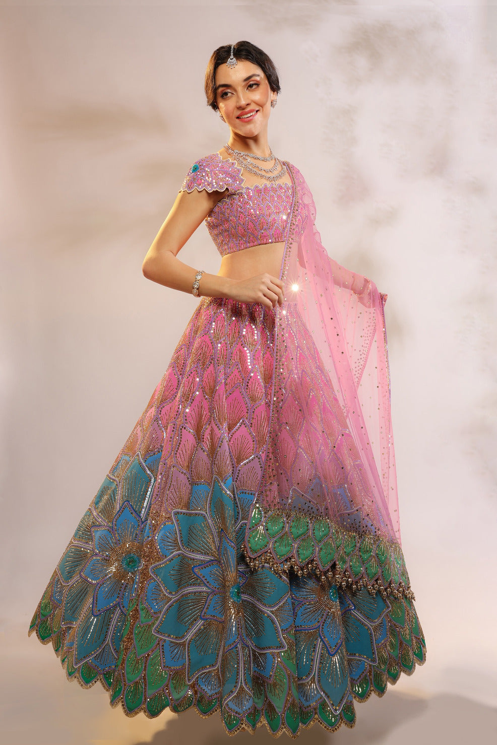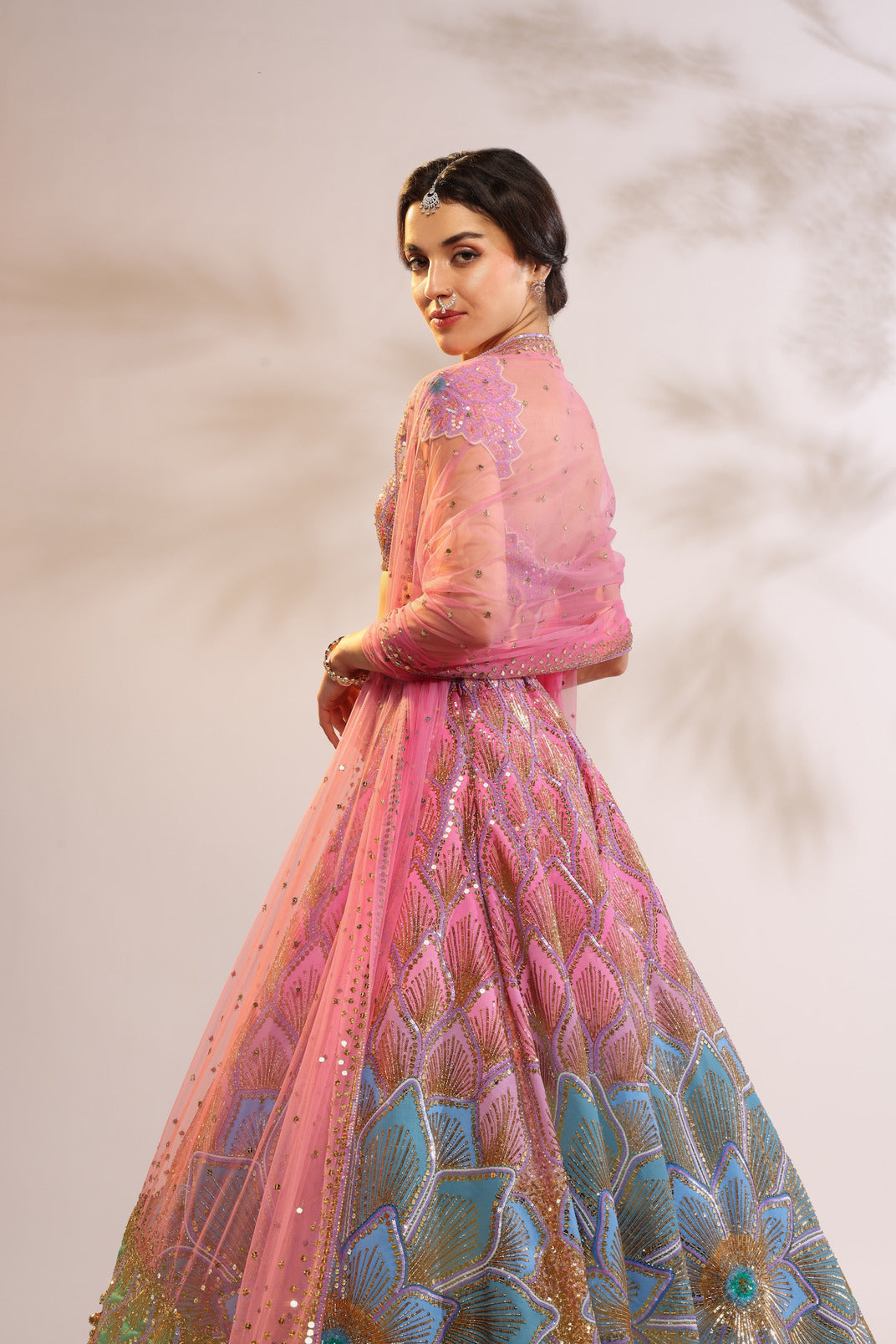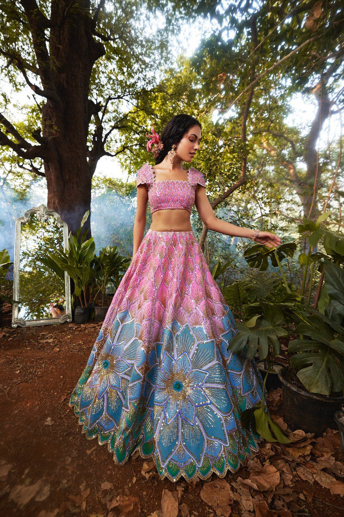The serene Sitara Lehenga flourishes with blooms, enveloped by lush greenery. It blends vibrant greens, soothing blues, and soft pinks in a harmonious symphony. Crafted together with mirrors and shiny beads adding a sparkling elegance, enhancing its natural beauty.