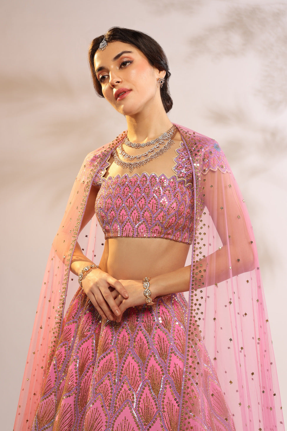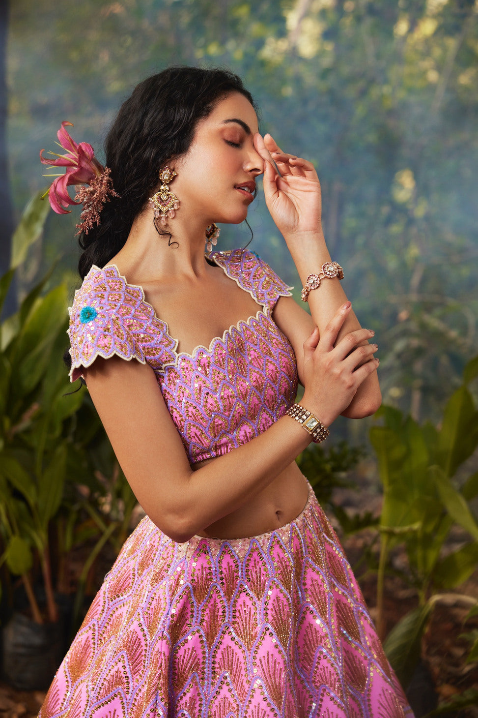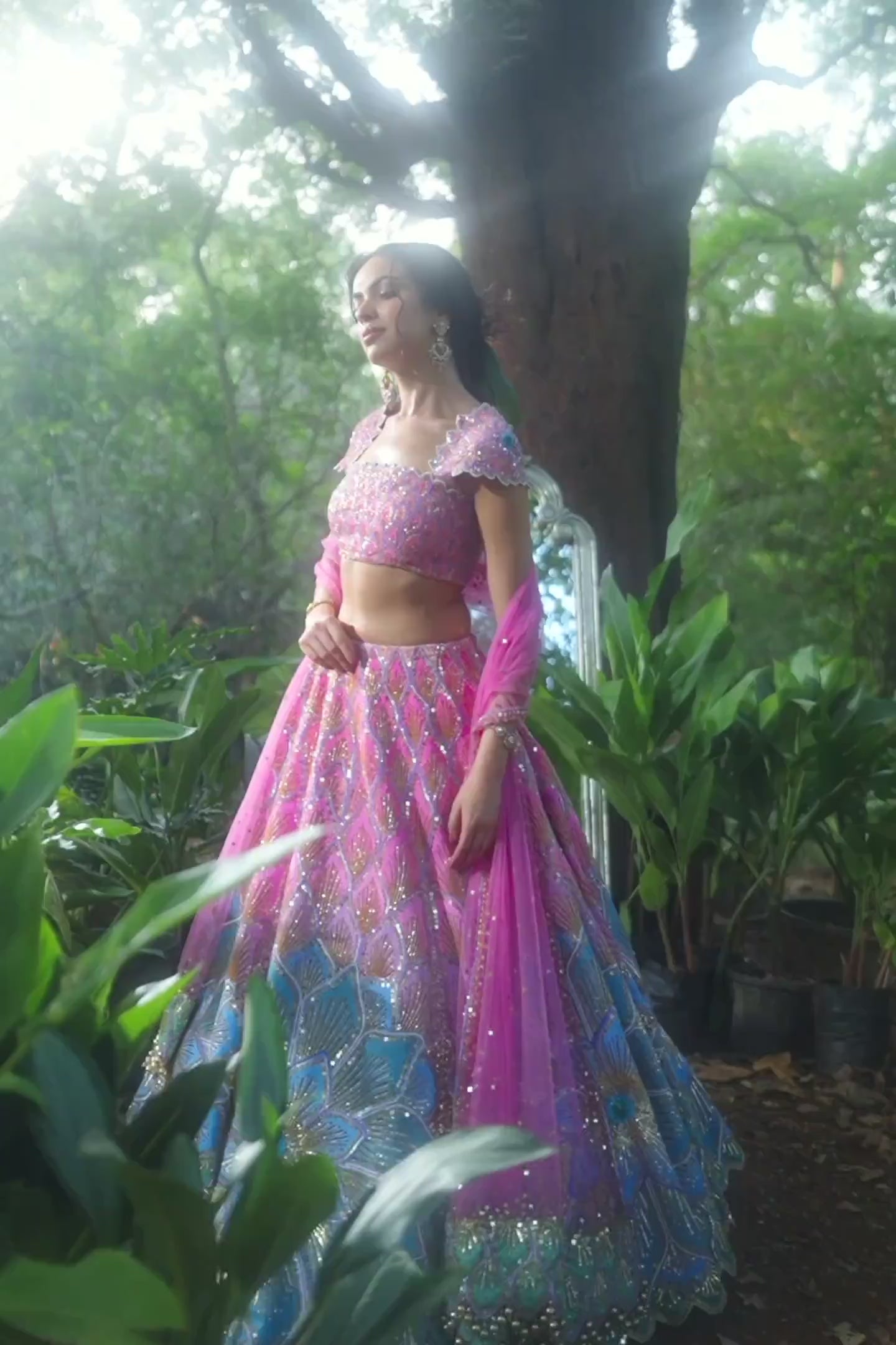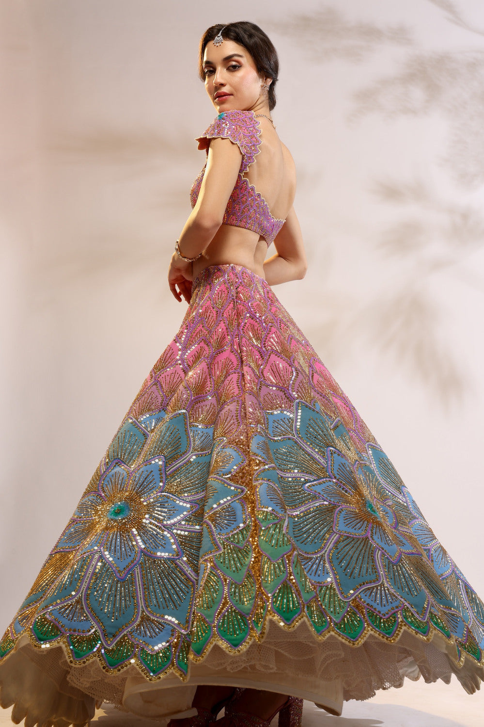 The serene Sitara Lehenga flourishes with blooms, enveloped by lush greenery. It blends vibrant greens, soothing blues, and soft pinks in a harmonious symphony. Crafted together with mirrors and shiny beads adding a sparkling elegance, enhancing its natural beauty.