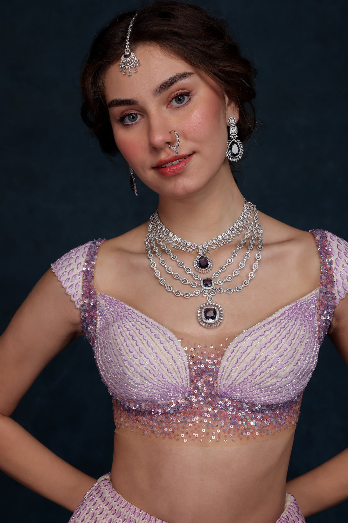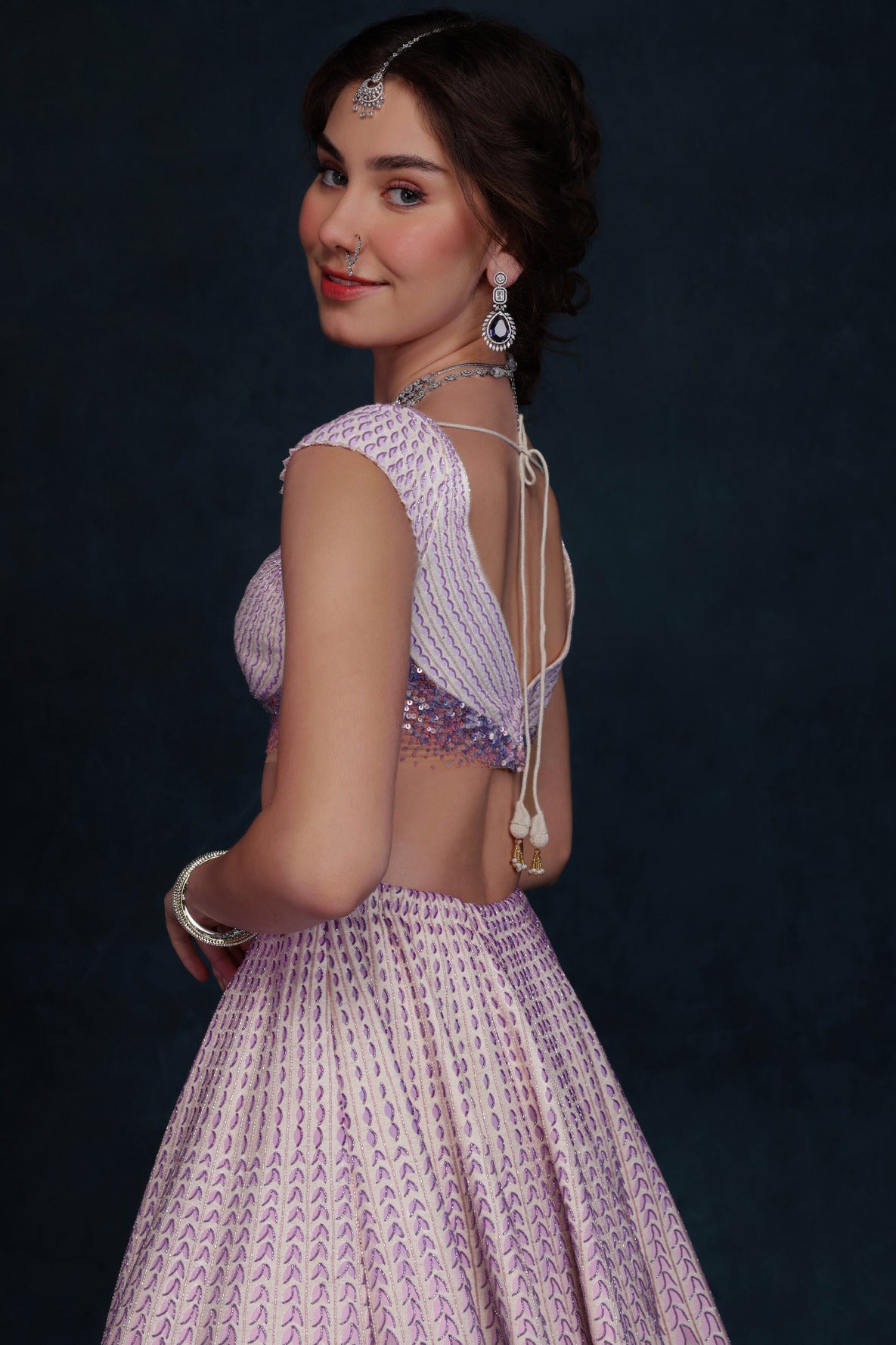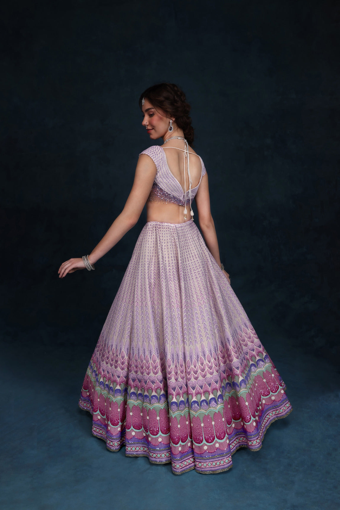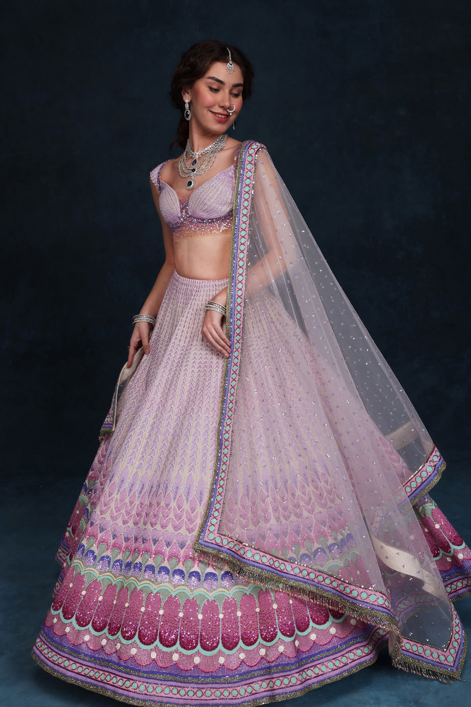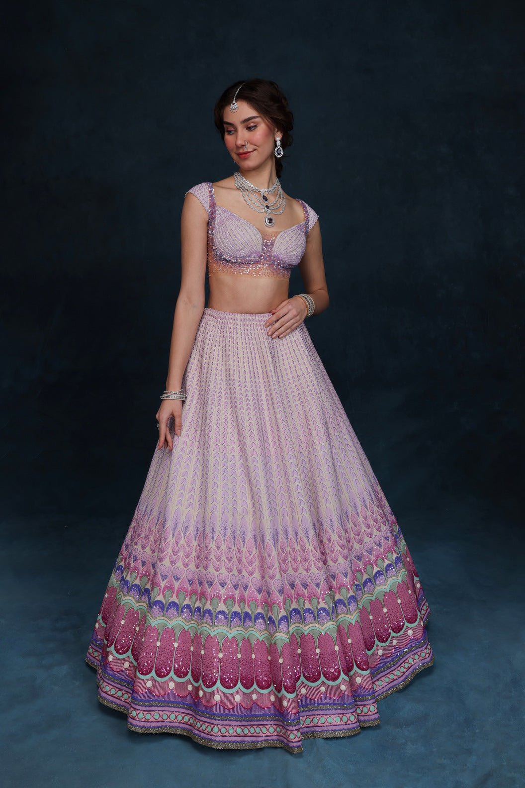 The Sprinkle Labh Lehenga Set features hand-painted motifs inspired by natural elements, creating a sense of fluidity. Paired with our signature form-fitting blouse and a stunning dupatta, this ensemble is designed to exude a luminous sparkle.